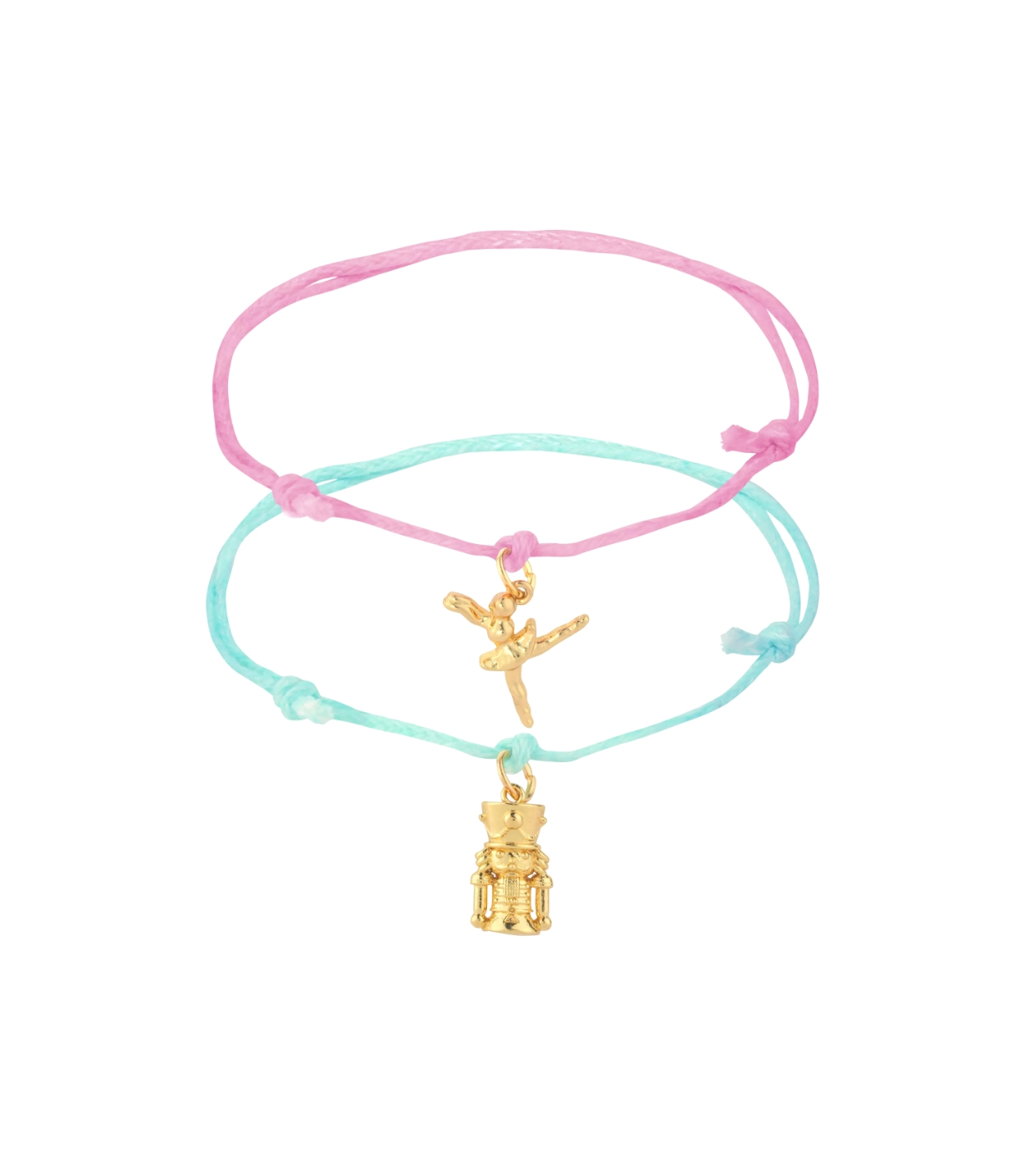 Uma das pulseiras apresenta um pingente de quebra-nozes com detalhes intrincados, enquanto a outra exibe uma bailarina em uma pose clássica, criando uma dupla perfeita inspirada na magia do balé e na época natalina.