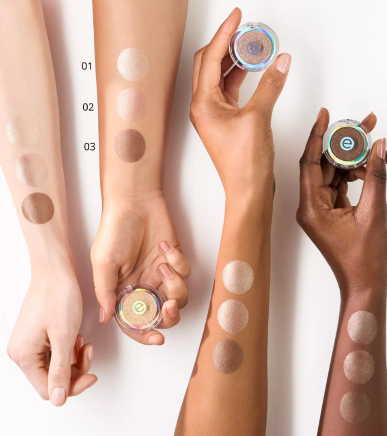 Realce o seu olhar com a sombra monocromática perolada da essence, um tom vibrante que reflete a luz de forma espetacular e proporciona um toque instantâneo de luminosidade.