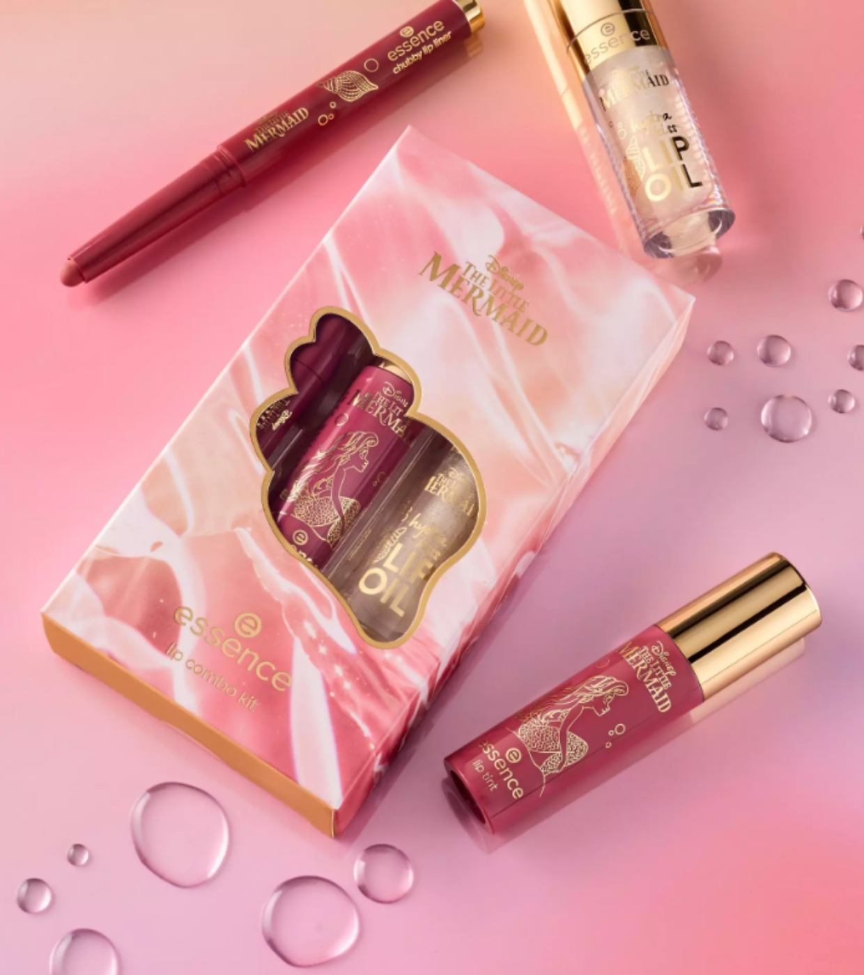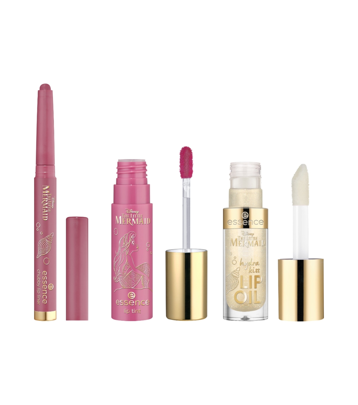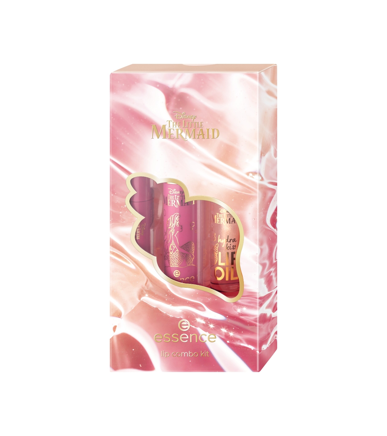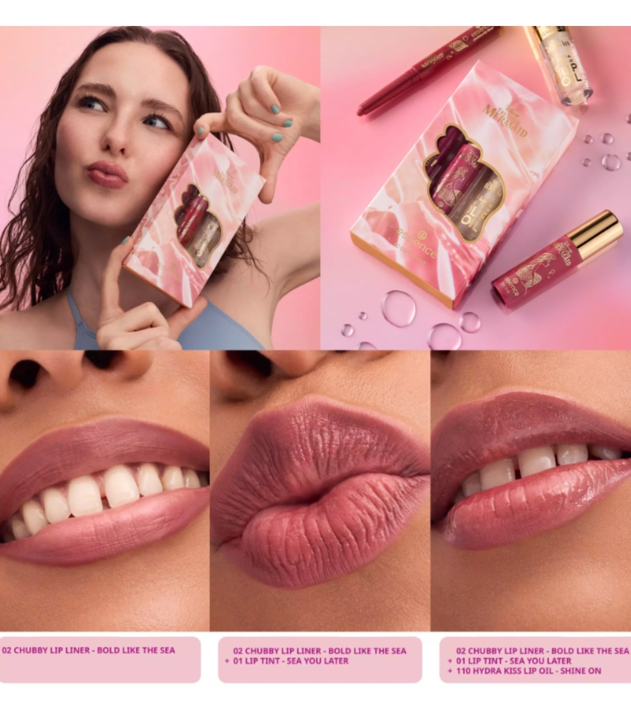 Consiga lábios irresistíveis com o conjunto de batons essence , inspirado no universo mágico de The Little Mermaid .