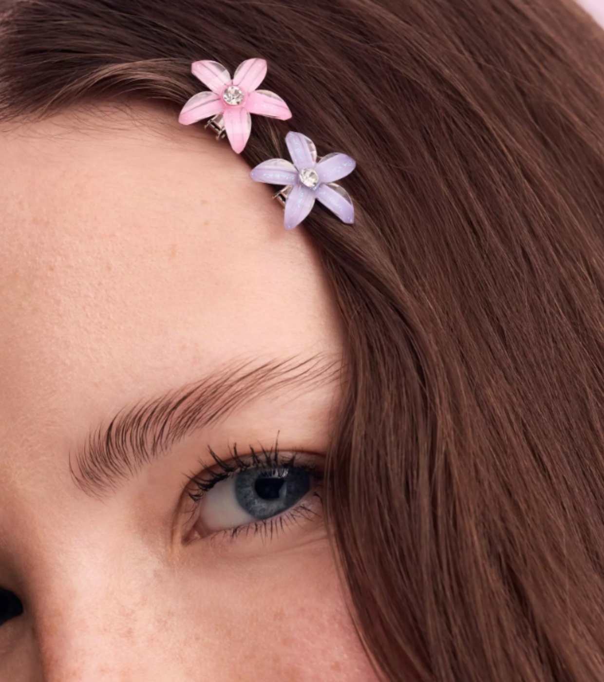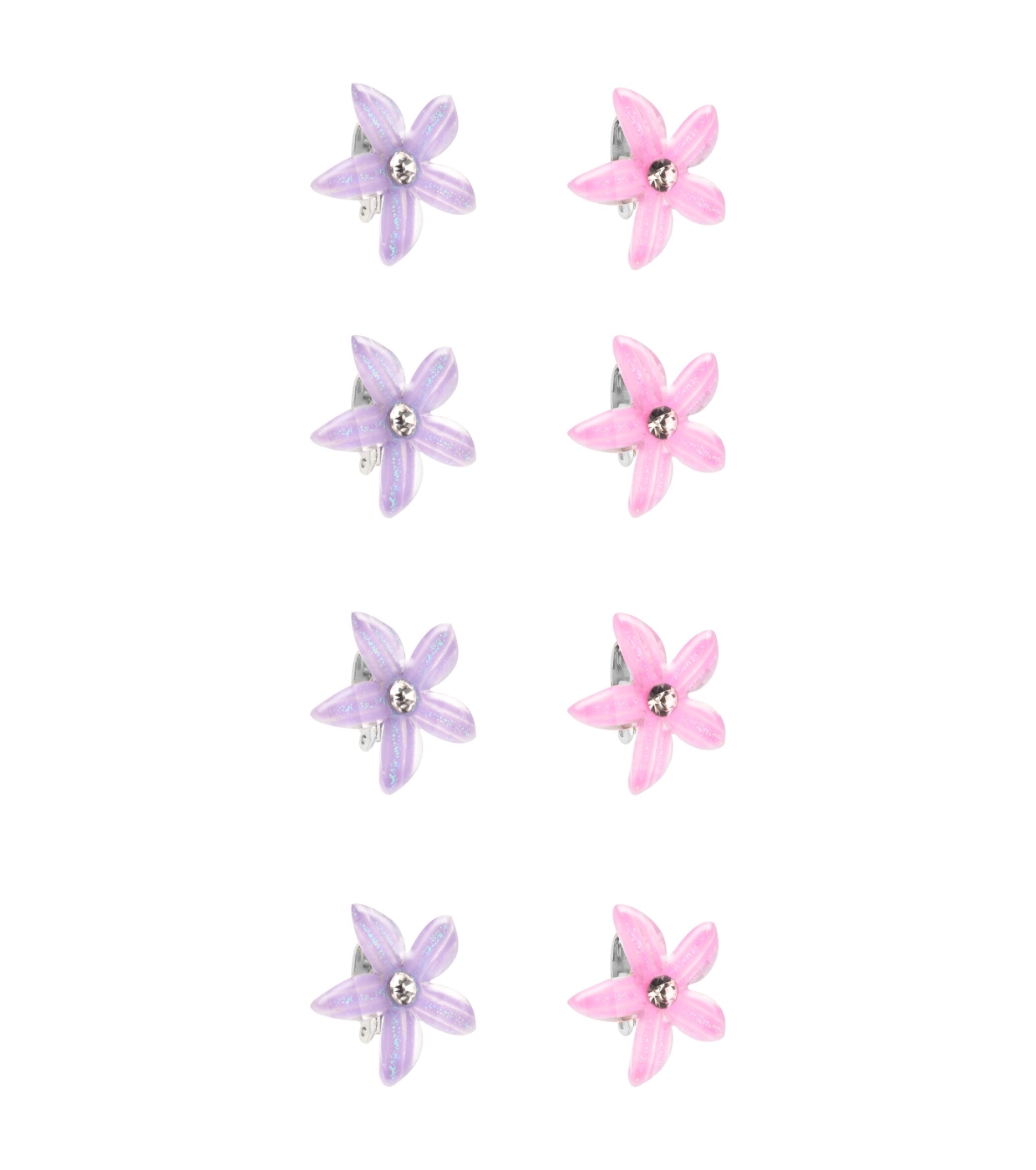 Este conjunto inclui 8 pequenos prendedores de cabelo em formato de flor em tons de rosa pastel e lilás, decorados com um detalhe brilhante no centro que adiciona um toque delicado e luminoso.