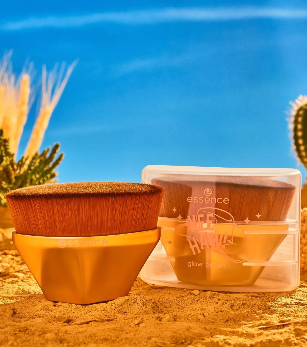 Ilumine seu visual com estilo cowboy! Este pincel supermacio Glow Brush Glow com cabo dourado é perfeito para aplicar seu blush ou iluminador favorito de maneira uniforme — até mesmo no corpo!