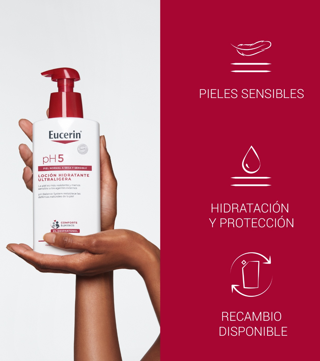 Eucerin pH5 Ultralight Hydrating Lotion é um creme corporal adequado para peles normais, a secas e sensíveis.
