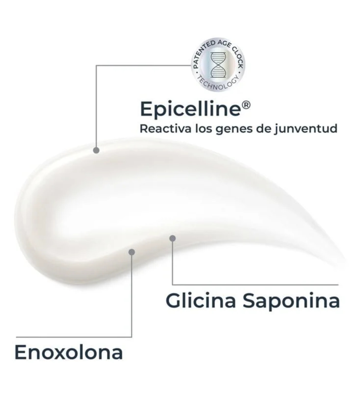 - Enriquecido com o poderoso princípio ativo Epicelline®, que reativa os genes da juventude desde a raiz, permitindo que as células da pele atuem de forma mais jovem.