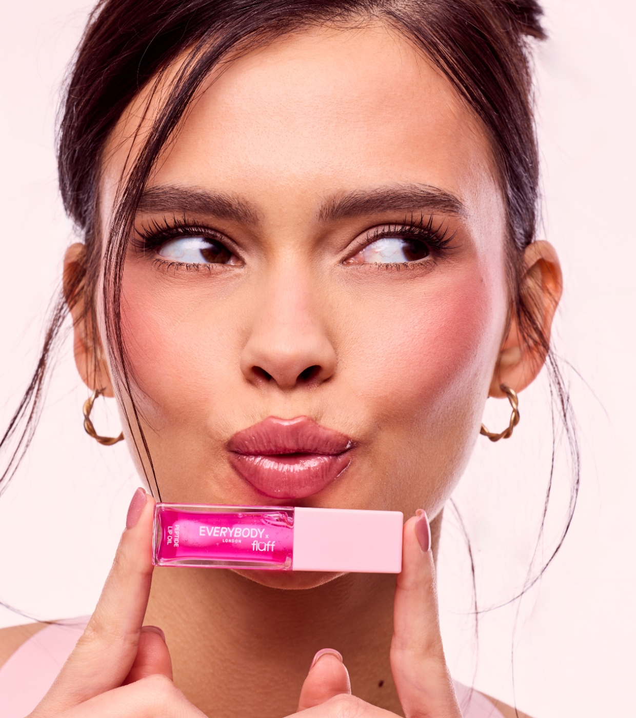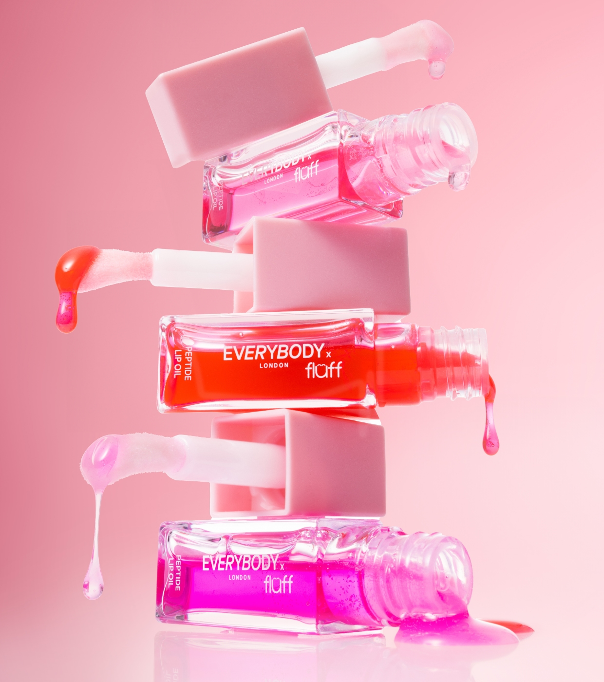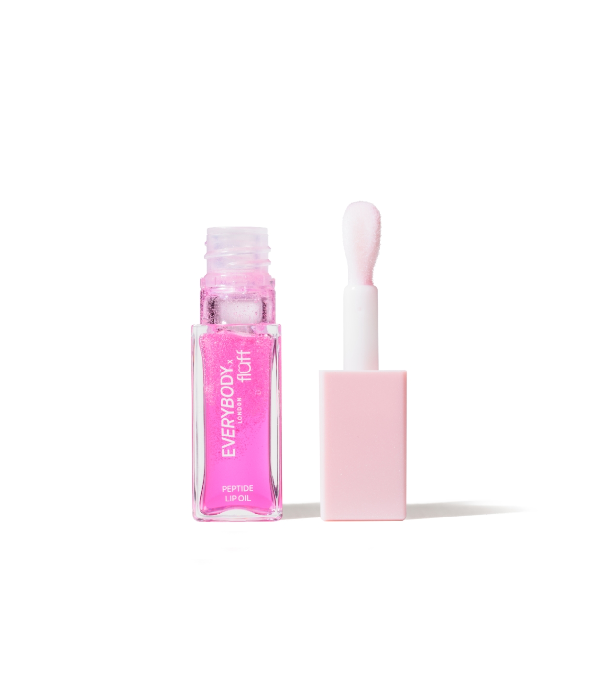 Descubra o óleo labial peptídico da colaboração Everybody London x Fluff , apresentado em um lindo recipiente transparente com design rosa.
