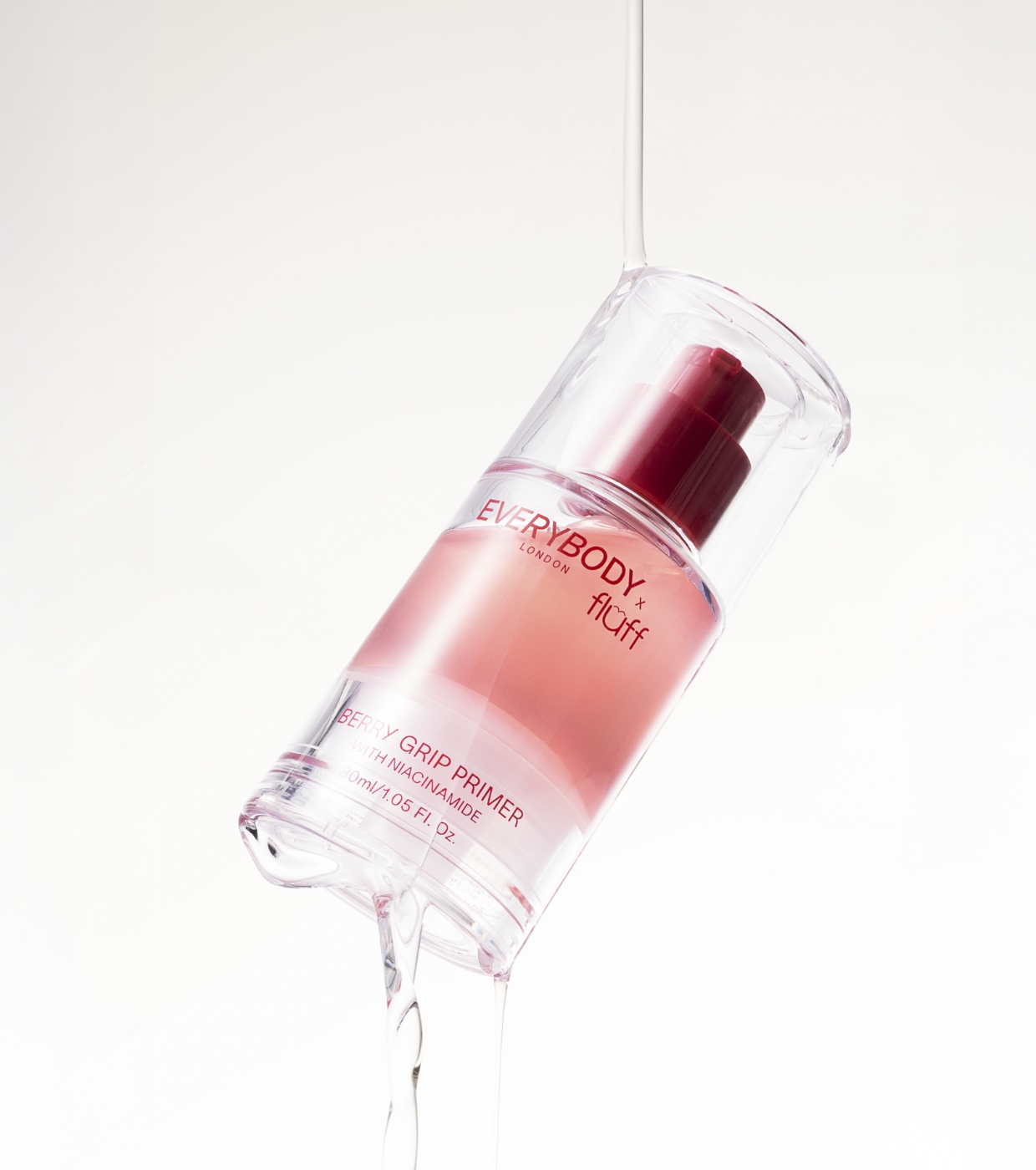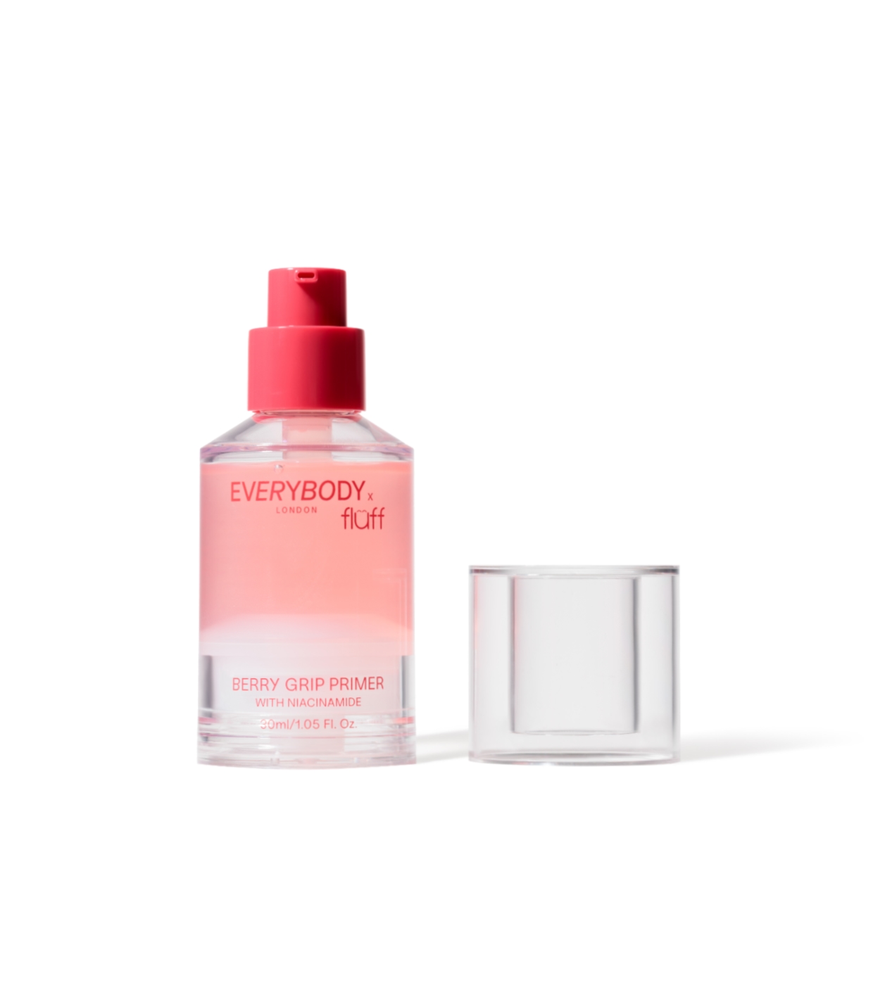 A base de maquiagem Berry Grip Primer, da colaboração Everybody London x Fluff, é apresentada em um recipiente transparente com um degradê rosa e um dispensador.