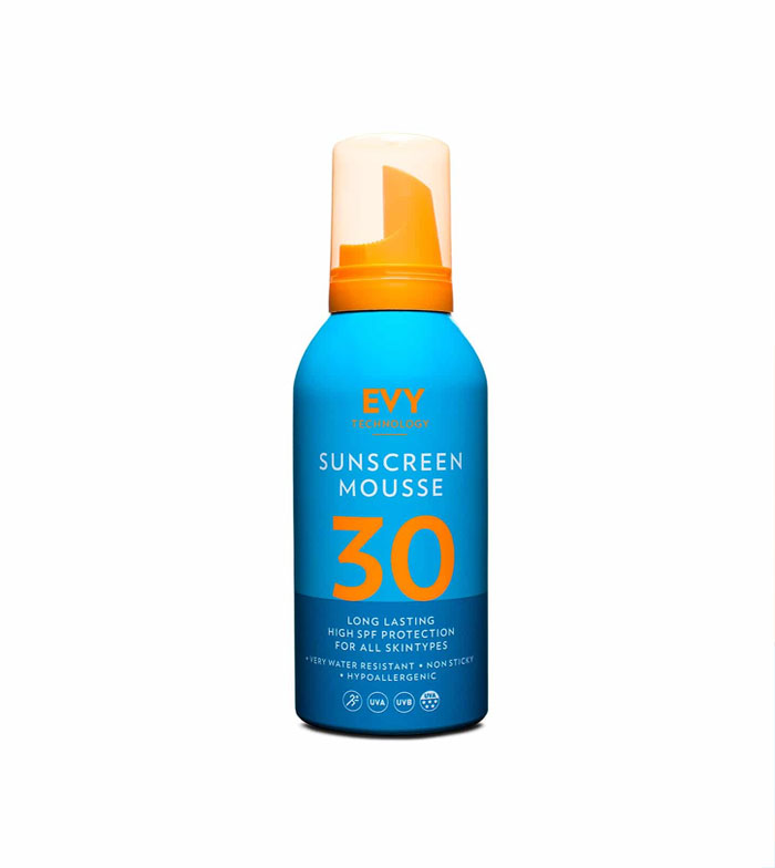 O protetor solar Sunscreen Mousse SPF 30 da Evy Technology tem uma textura de mousse ultraleve para rosto e corpo, que oferece proteção solar de alto espectro extraordinariamente confiável contra os raios UVA/UVB graças à sua tecnologia médica patenteada.