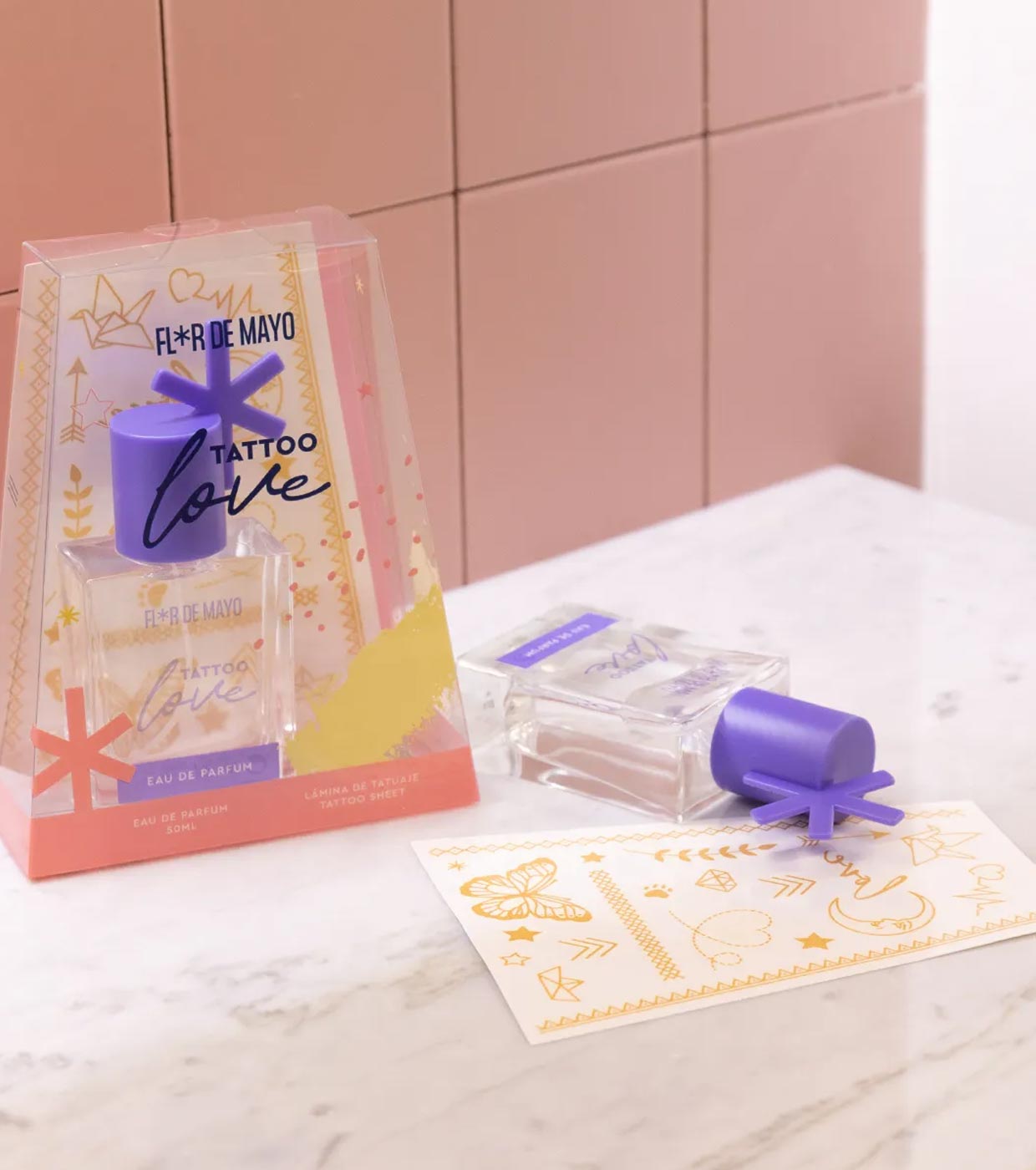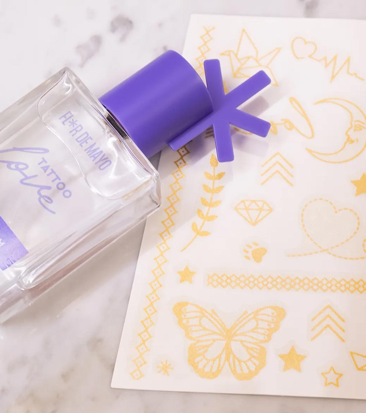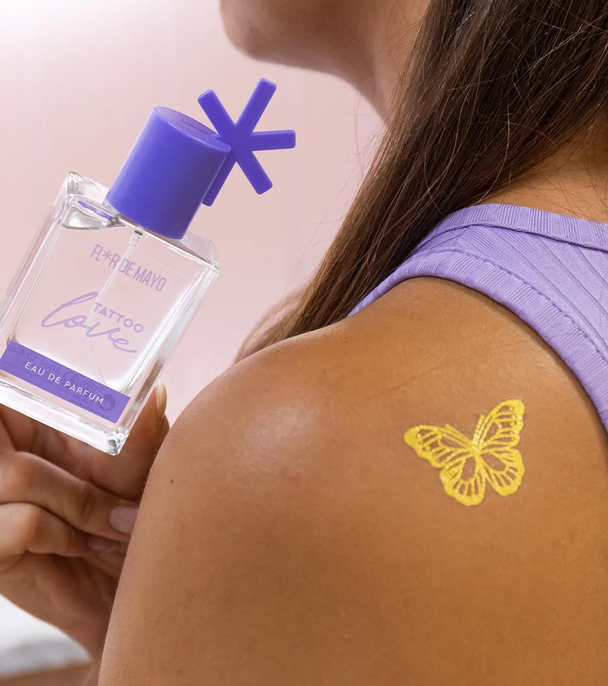 Este pack ideal inclui um perfume refrescante com aroma doce e frutado de champanhe, perfeito para a estação, e algumas tatuagens metálicas que seguem as tendências mais cool do verão.