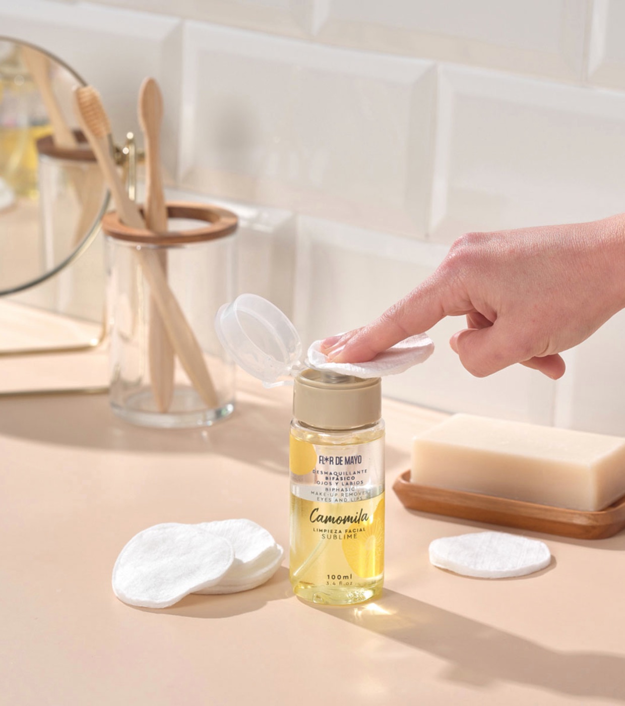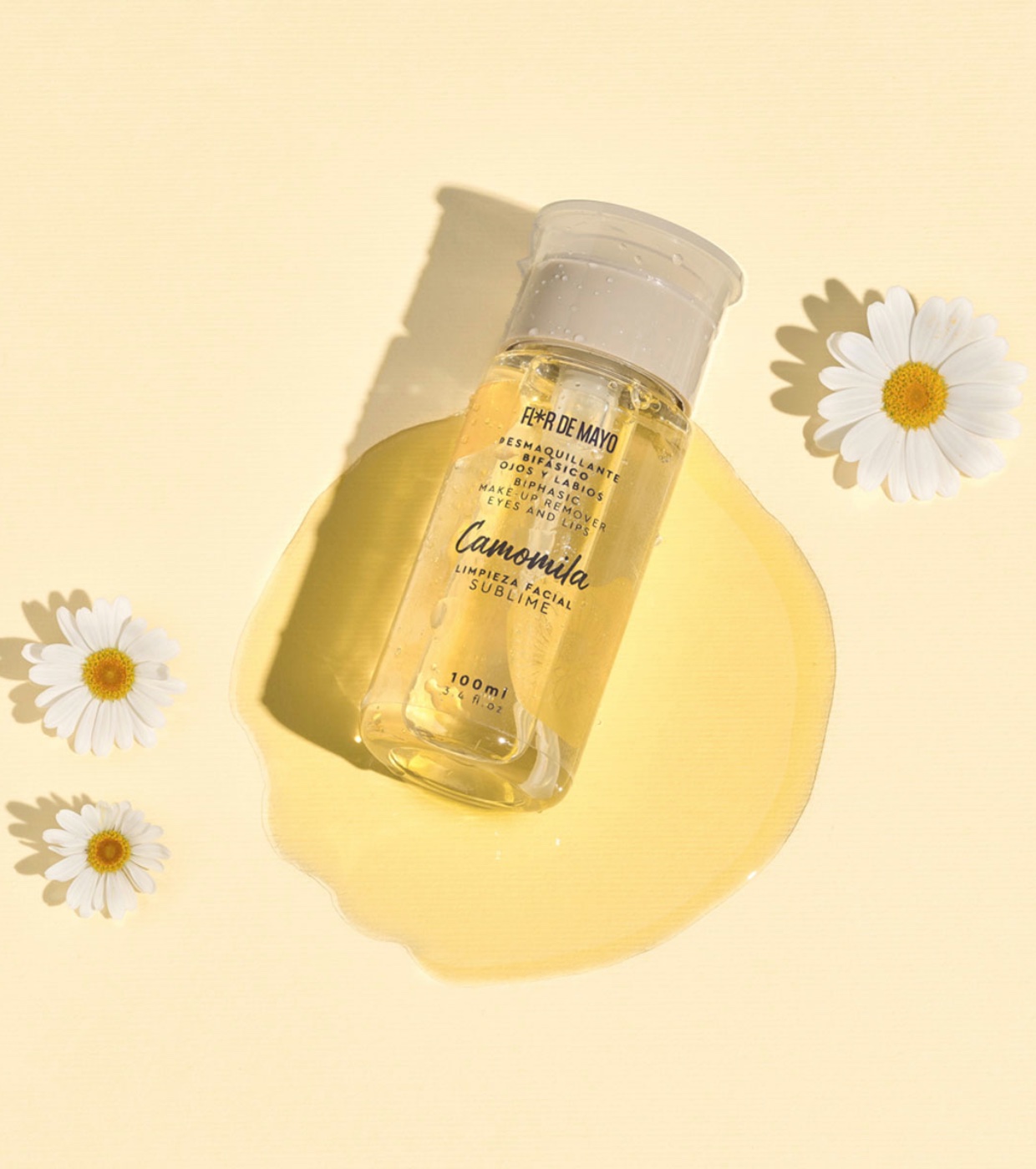 Descubra a suavidade e a eficácia do demaquilante bifásico Camomila Sublime da Flor de Mayo , formulado com glicolipídios naturais e glicerina para remover até as maquiagens mais resistentes sem ressecar a pele.