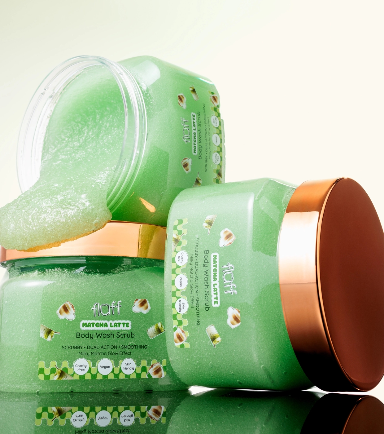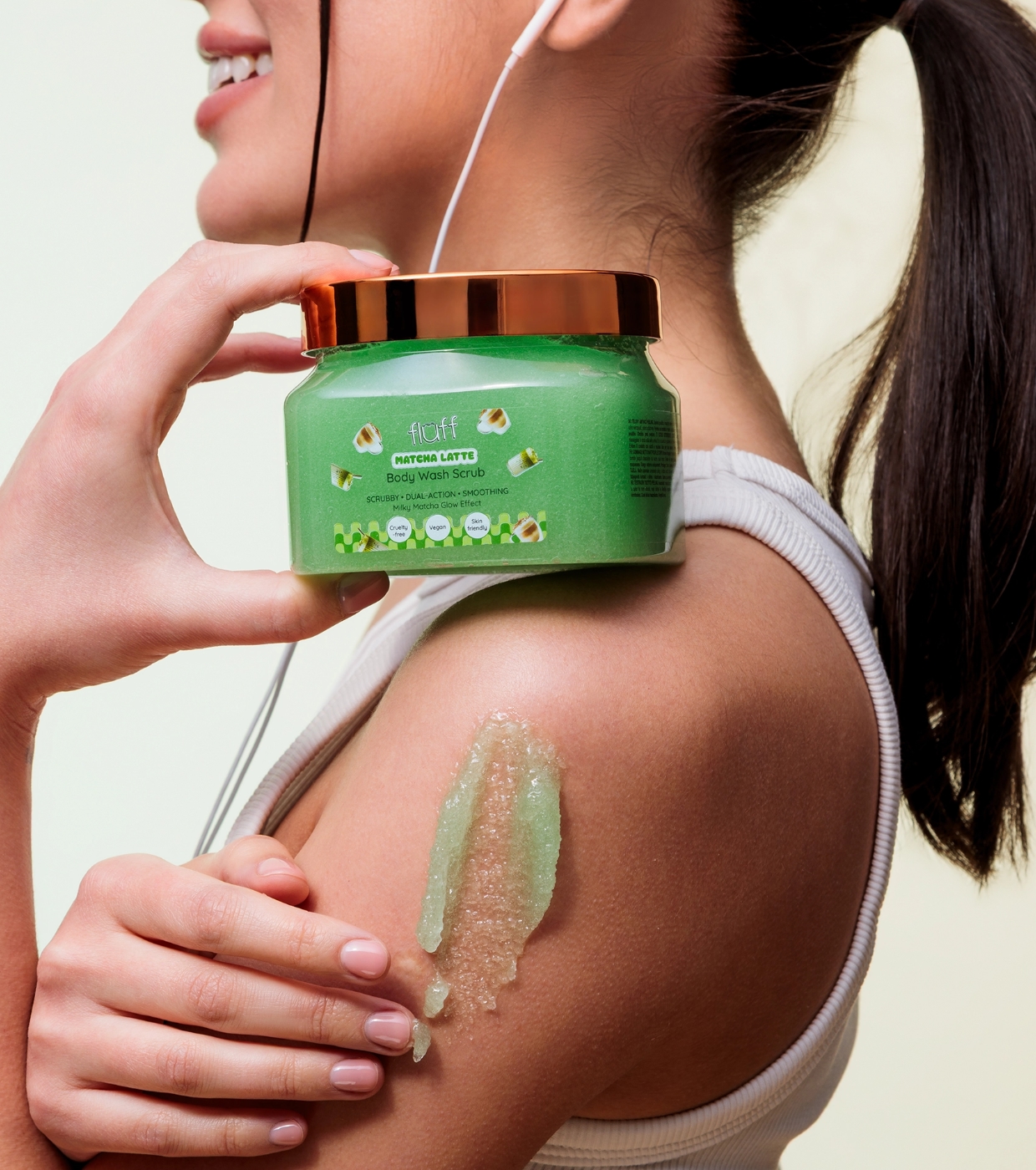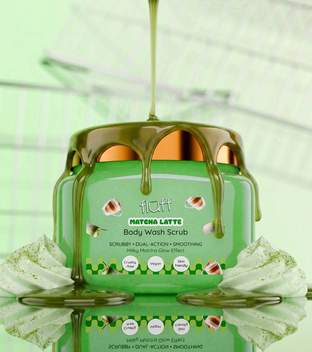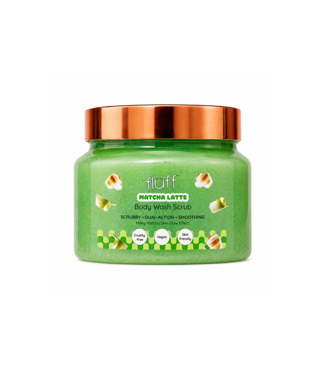Desfrute de uma pele macia, fresca e equilibrada com o esfoliante corporal Matcha Latte da Fluff, um peeling corporal que limpa, esfolia e cuida da sua pele sem ressecá-la.