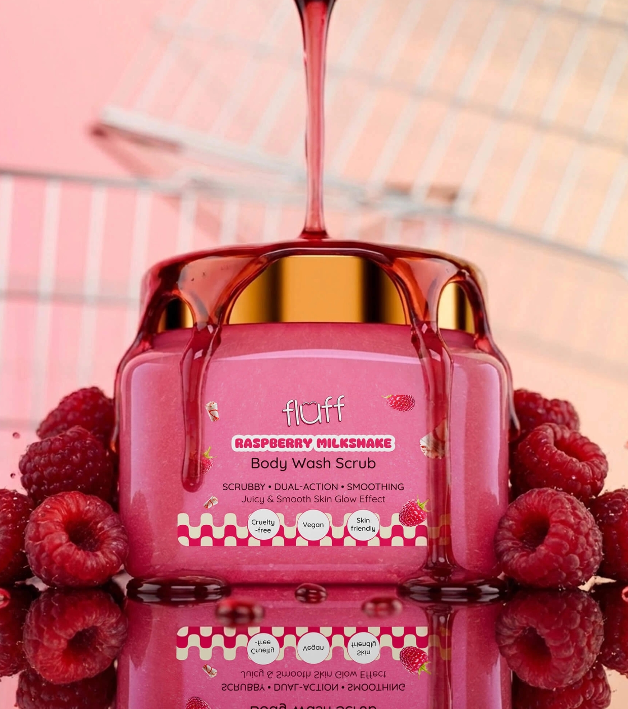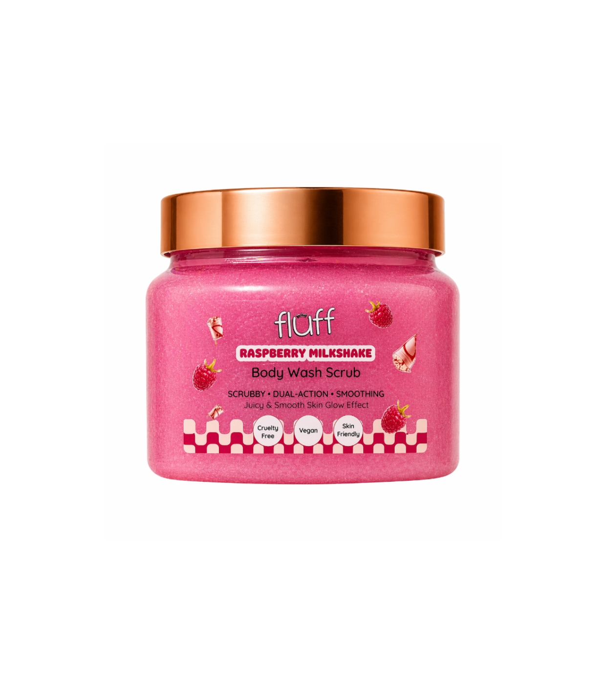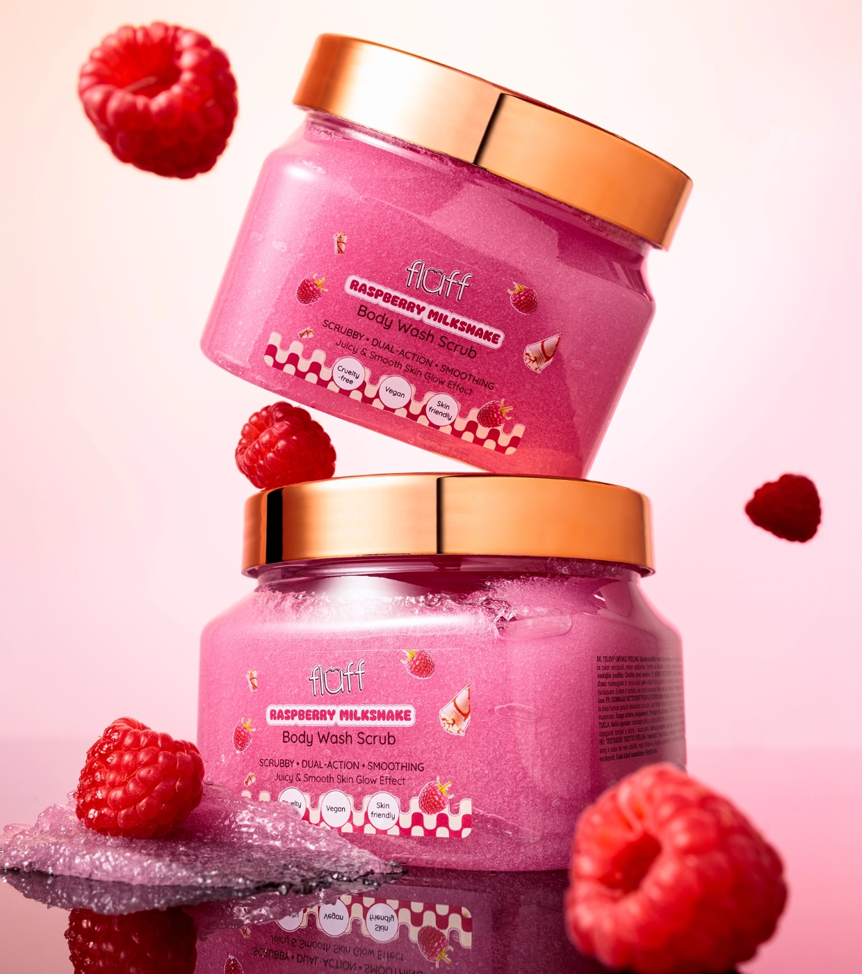Desfrute de uma pele macia, suave e renovada desde a primeira utilização com o esfoliante corporal Raspberry Milkshake da Fluff , o peeling corporal que limpa, esfolia e nutre num só passo.