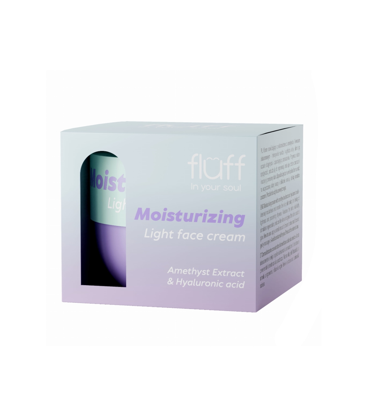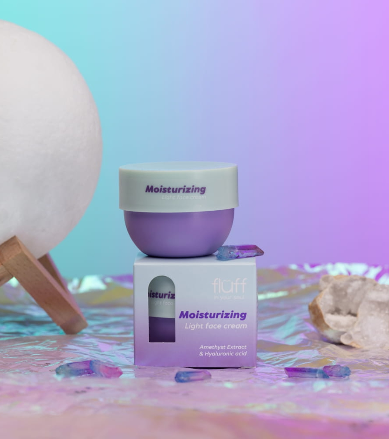 Este creme facial hidratante com extrato de ametista e ácido hialurônico da Fluff oferece hidratação intensa que suaviza a pele, eliminando a sensação de repuxamento e prevenindo o ressecamento.