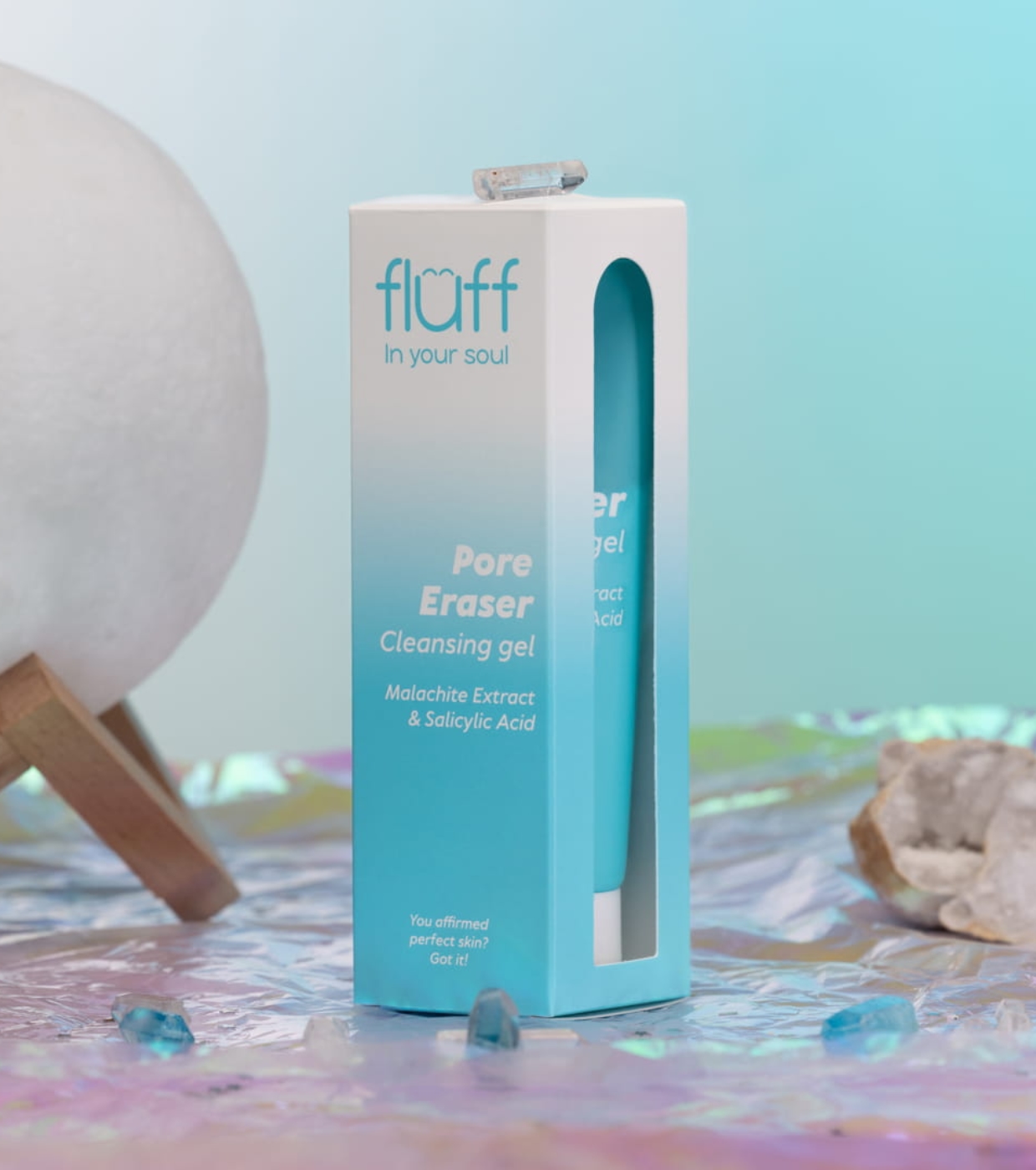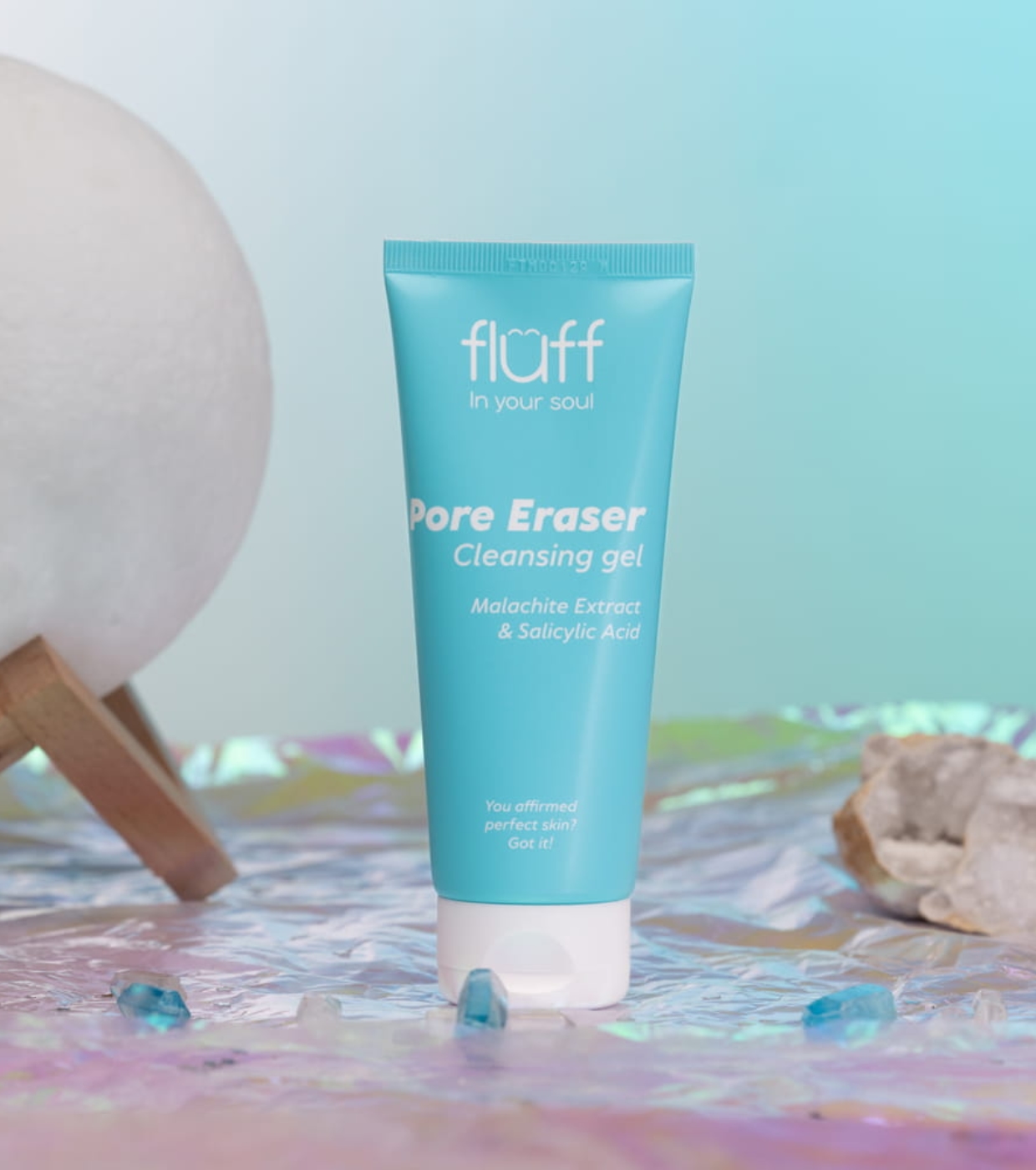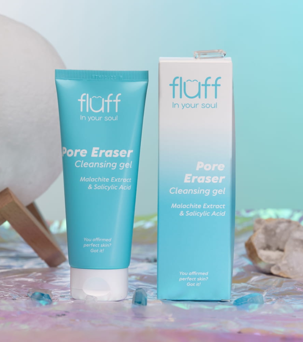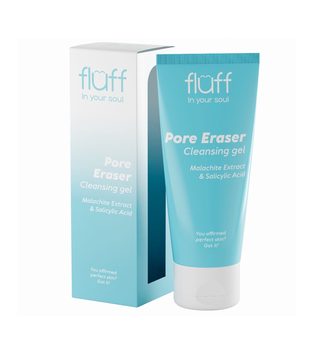 O Gel de Limpeza Facial com Extrato de Malaquita e Ácido Salicílico Pore Eraser da Fluff não só remove eficazmente as impurezas, mas também esfolia suavemente a epiderme, deixando a pele fresca e hidratada.