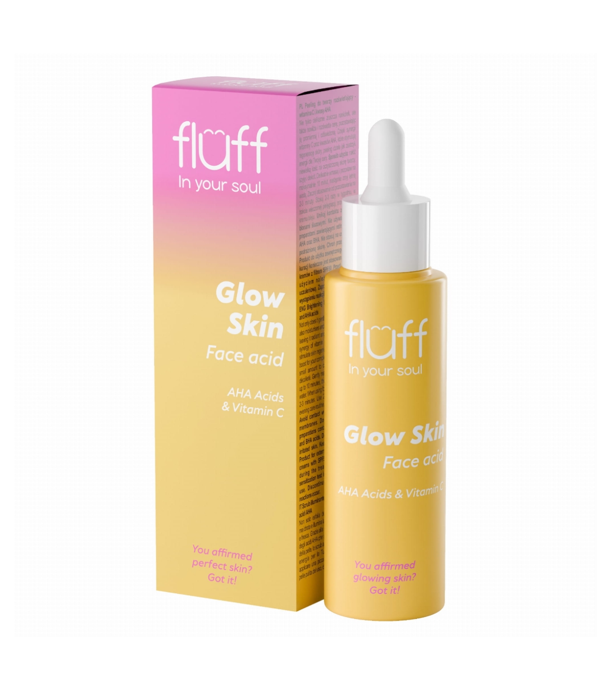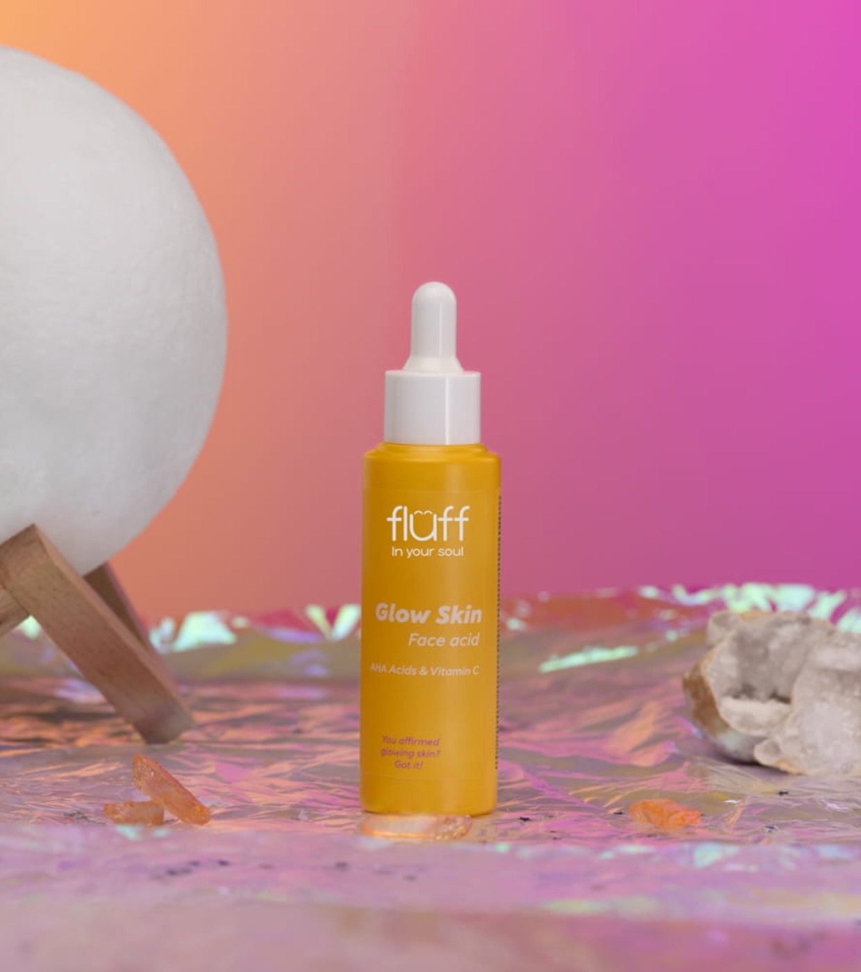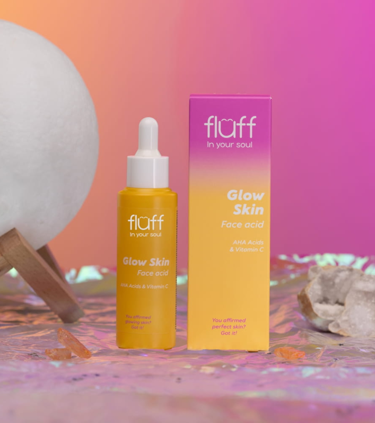 O Peeling Facial Iluminador com Vitamina C Glow Skin da Fluff esfolia suavemente a epiderme enquanto hidrata e ilumina o rosto, deixando-o radiante e fresco.