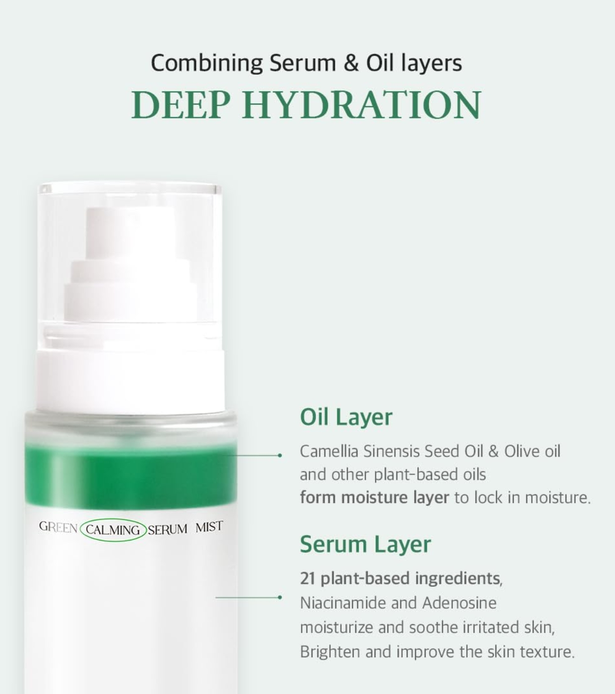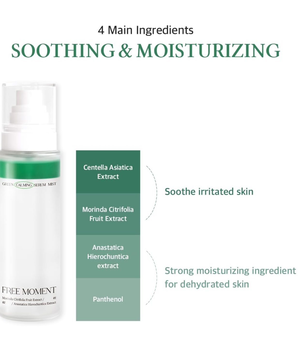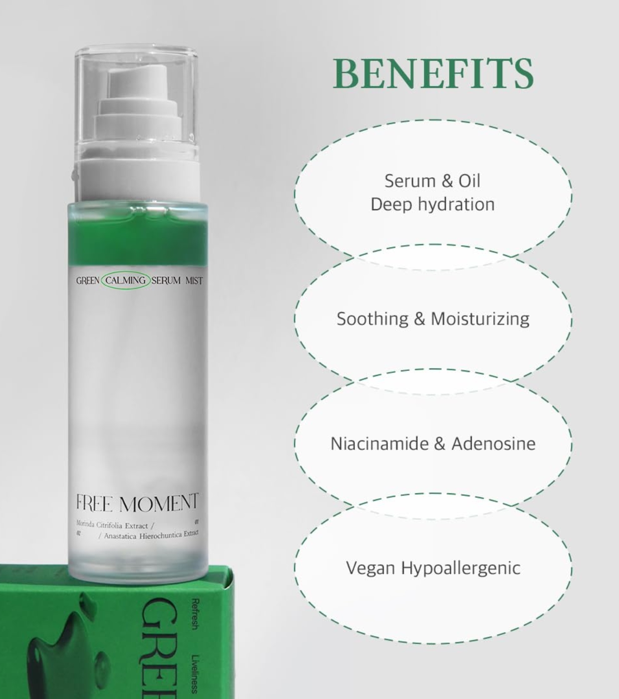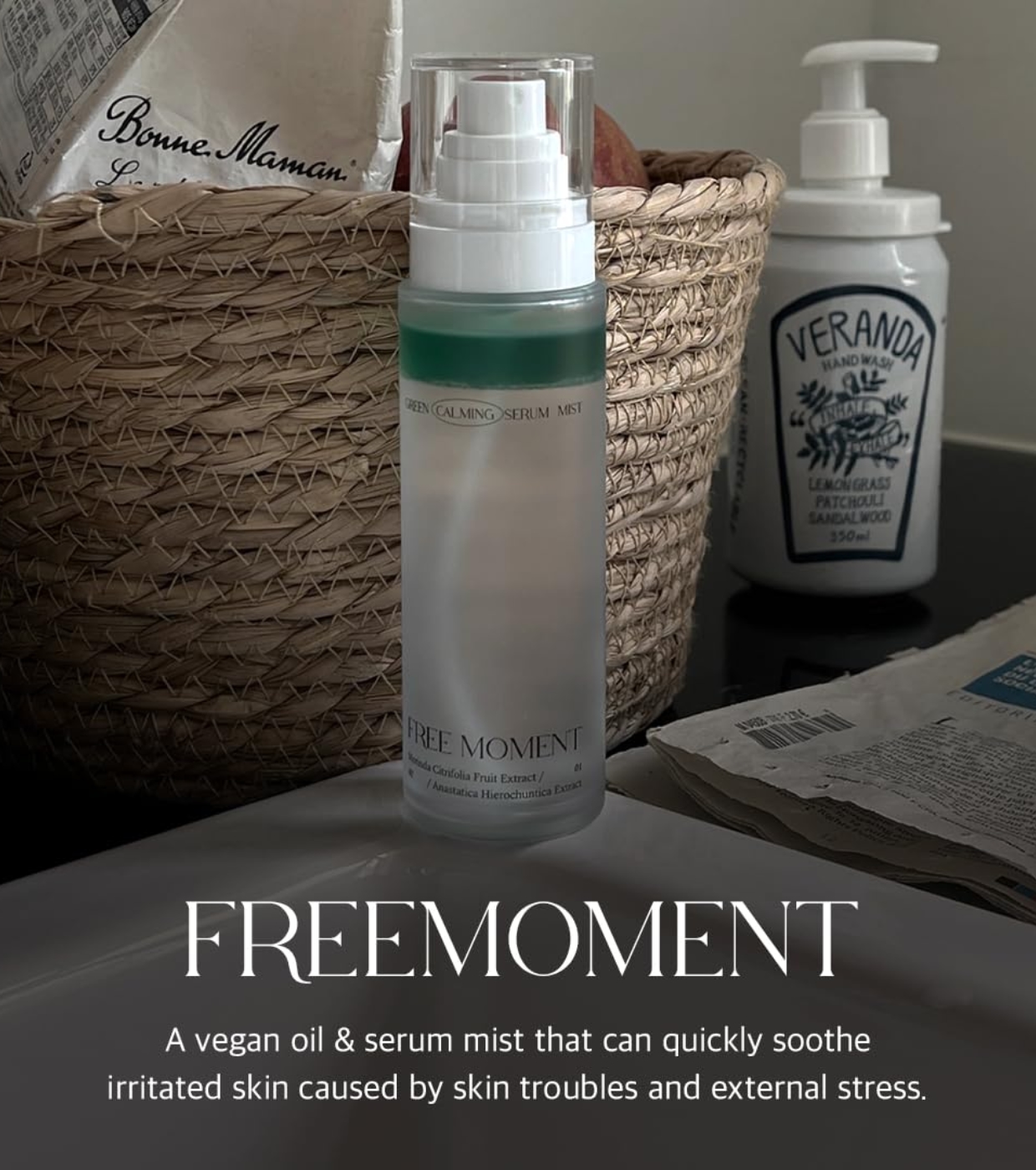 Formulado com óleo de semente de chá verde e azeite de oliva, este calmante Green Serum Mist Free Moment é vegano e bifásico e cria uma barreira protetora de hidratação, acalmando instantaneamente a pele irritada.
