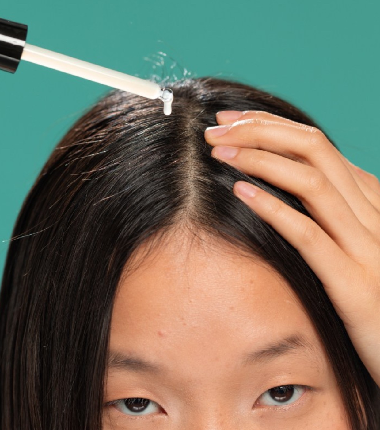 2. Todas as noites, antes de dormir, encha uma pipeta inteira (1 ml) e distribua-a em forma de gotas em diferentes pontos do couro cabeludo, separando os cabelos para que as gotas penetrem no folículo piloso.