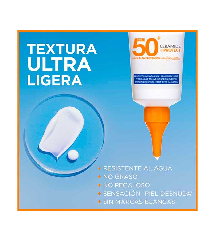Sua fórmula fluida e leve é resistente à água e não deixa sensação gordurosa ou pegajosa.