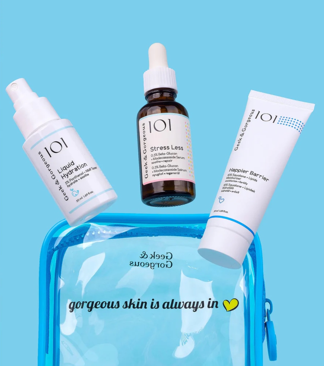 O trio vem em uma bolsa de toalete quadrada de edição limitada em azul geek que pode se tornar sua nova companheira de viagem.