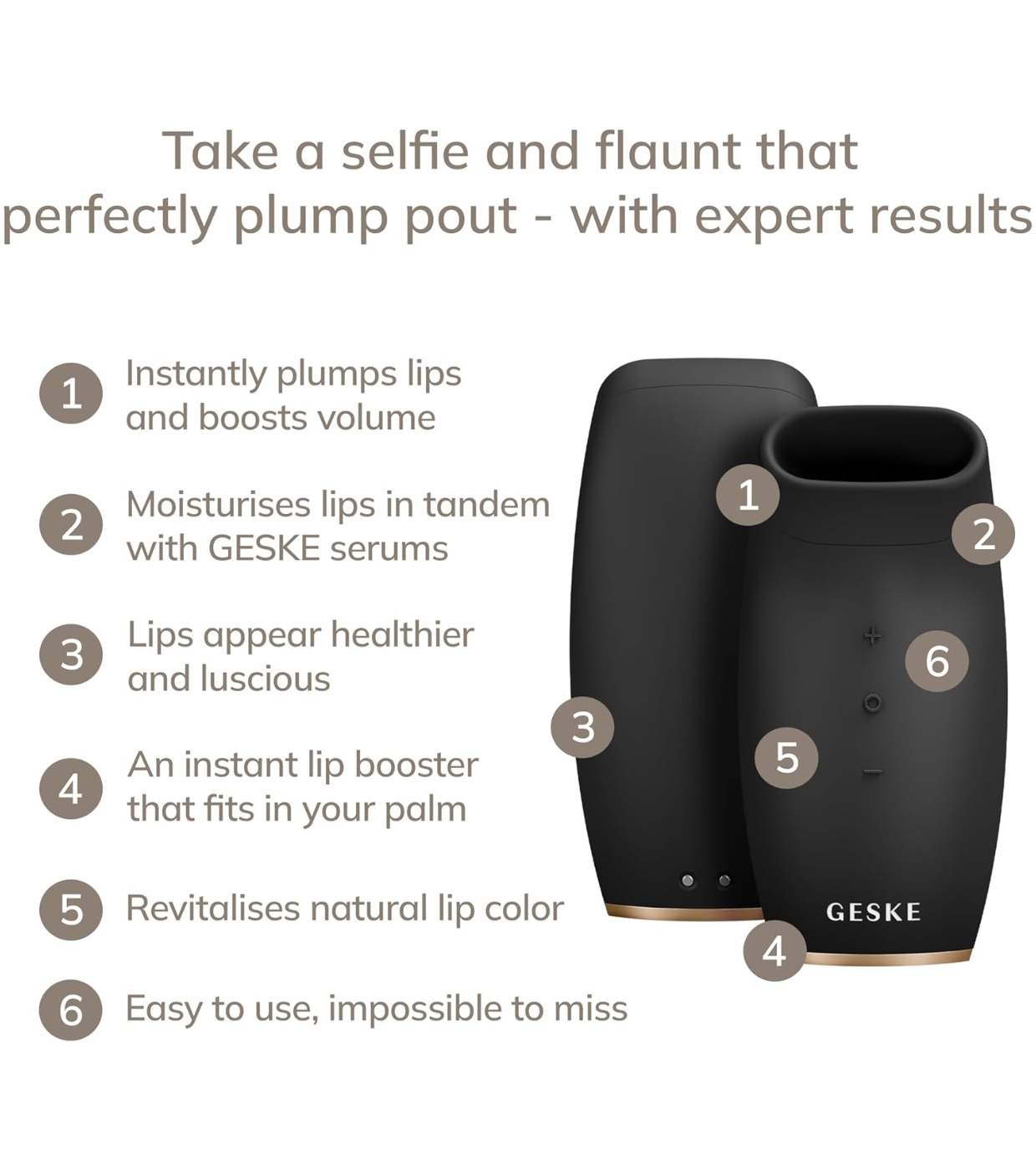 O dispositivo Lip Volumizer & Booster da Geske é um aparelho de beleza de última geração, projetado para manter os lábios mais volumosos, definidos e com aparência jovem, dia após dia.