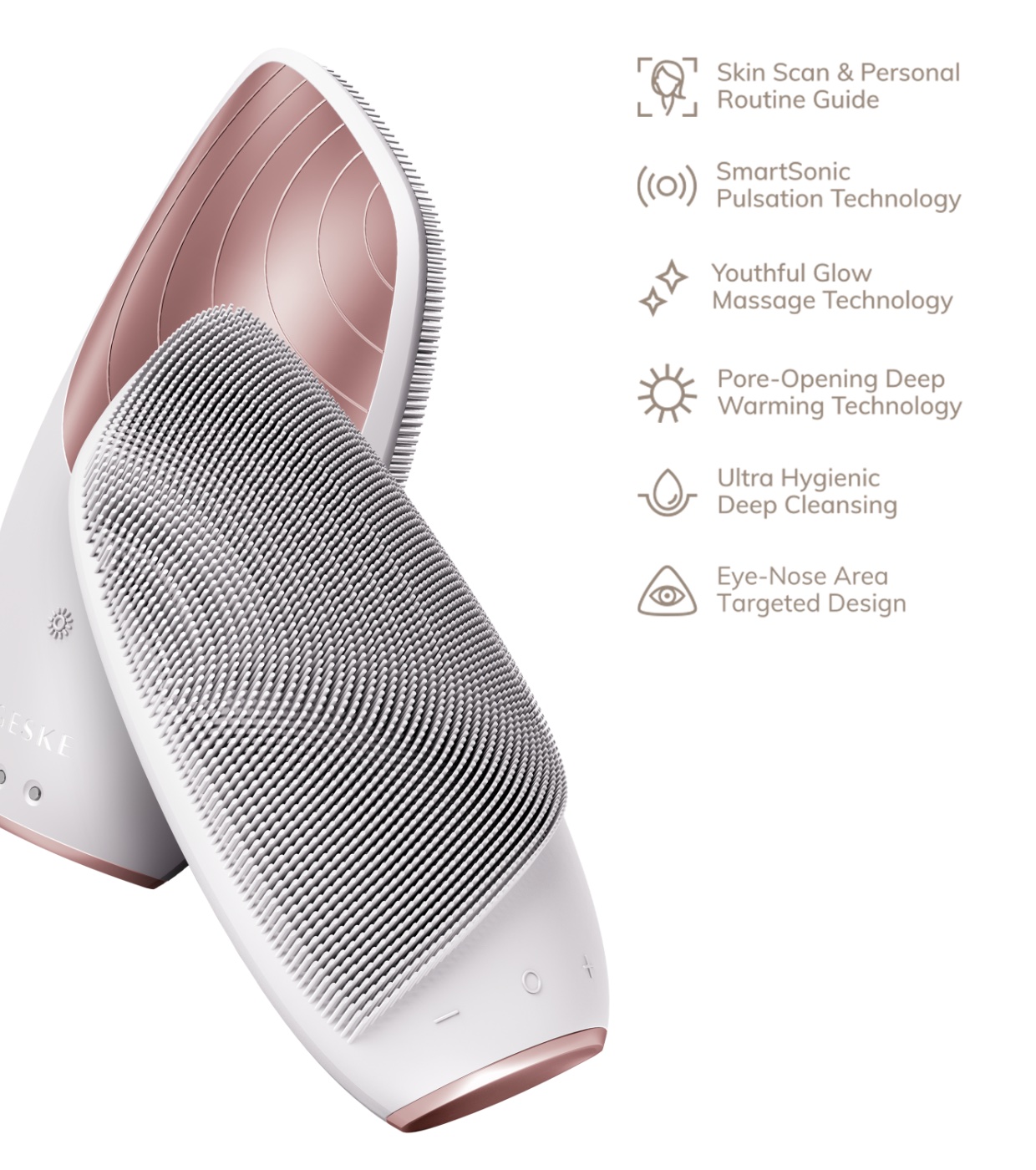 SmartAppGuided™ Sonic Thermo Facial Brush é um limpador facial, escova térmica e massageador tudo-em-um.