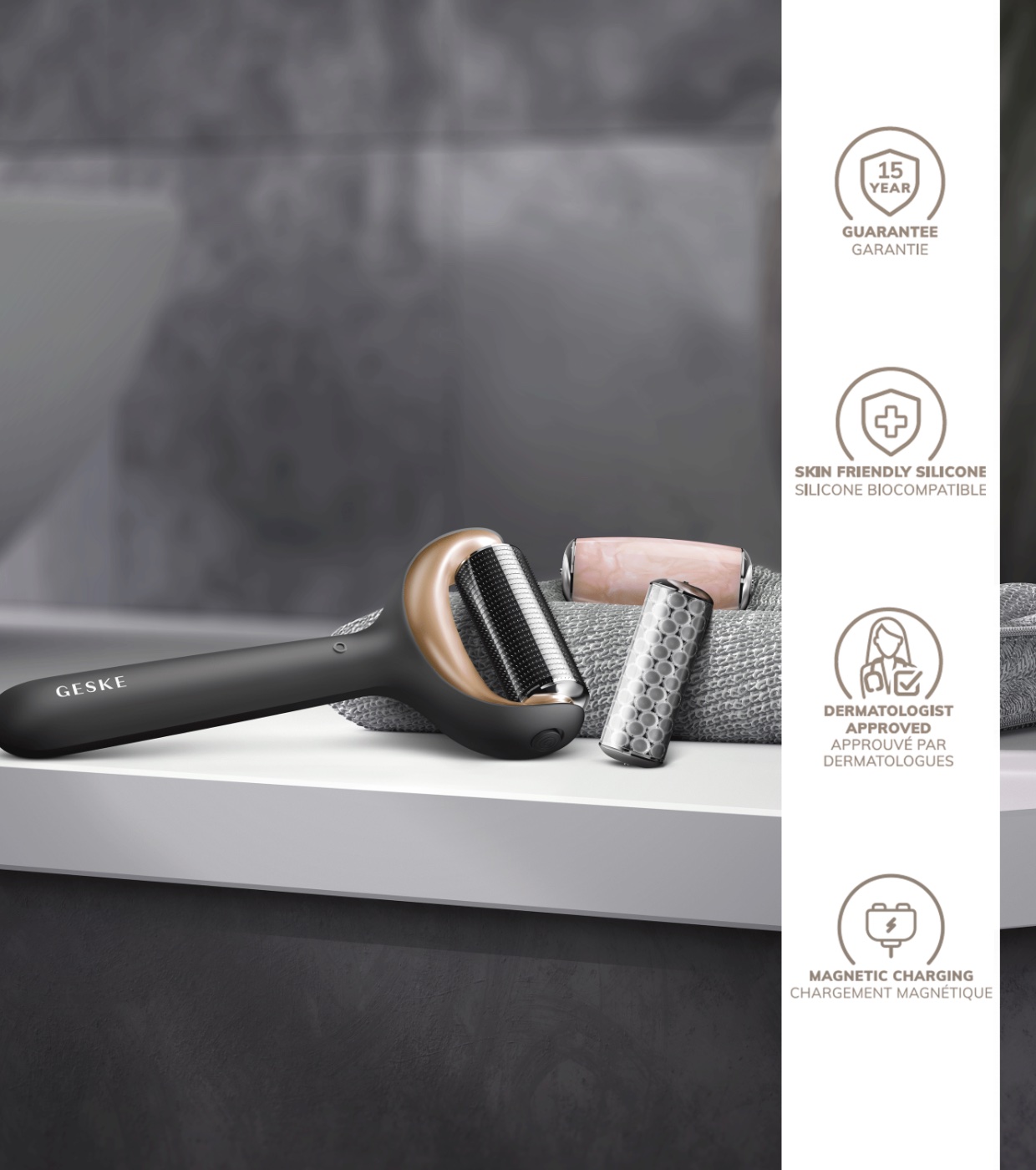 O MicroNeedle Face & Body Roller | 9 em 1 inclui três acessórios intercambiáveis: microagulhamento, resfriamento e quartzo rosa.