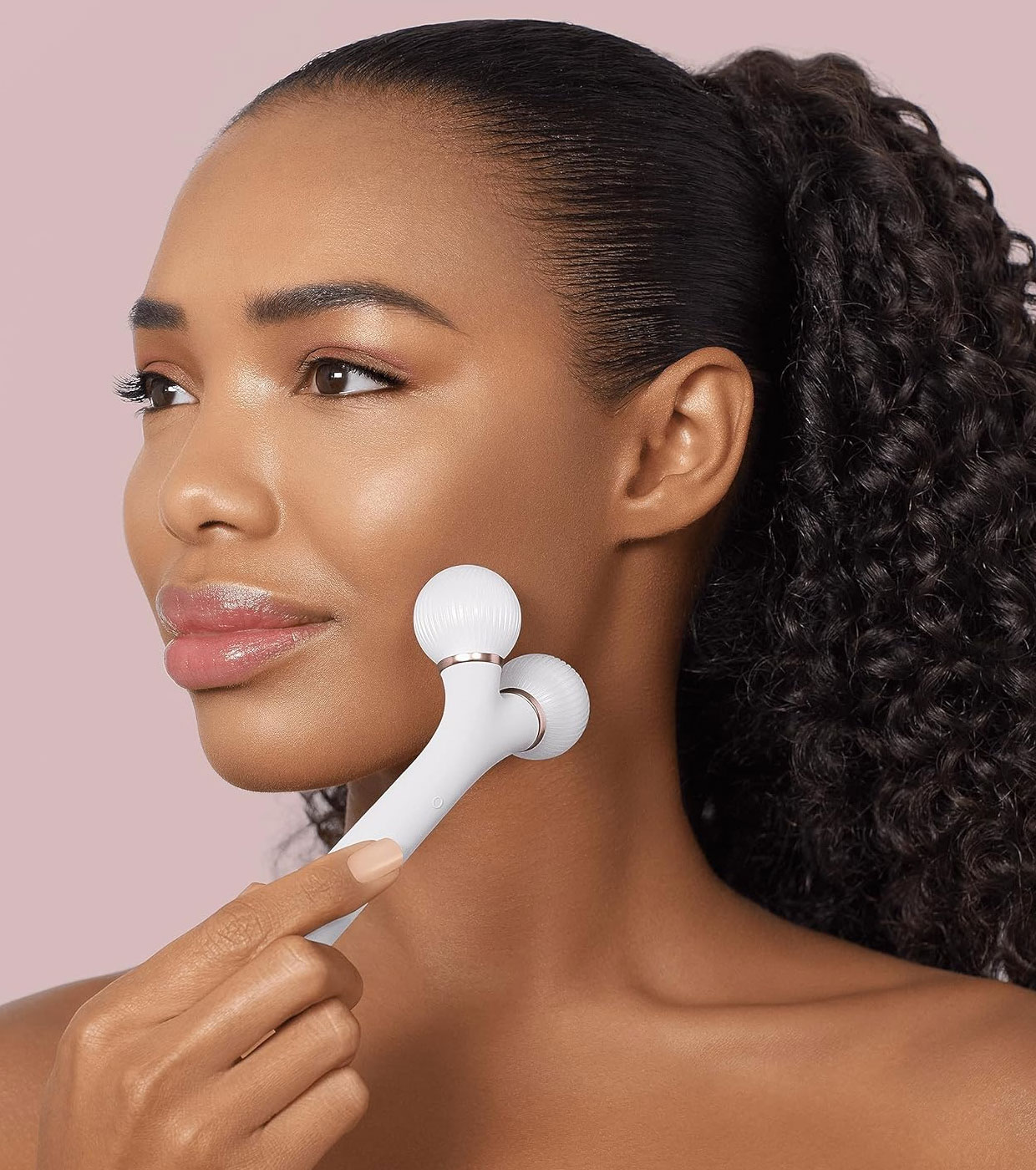 Este rolo facial sônico foi projetado para apertar e refinar visivelmente a pele e os contornos faciais.