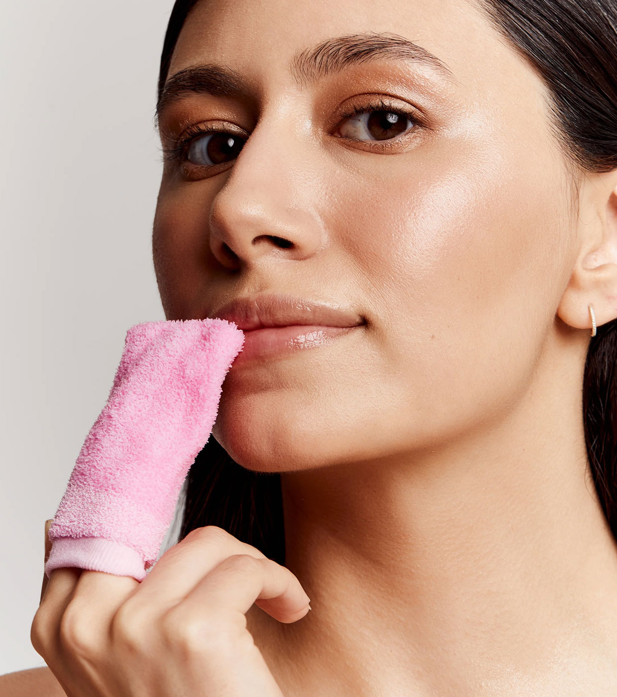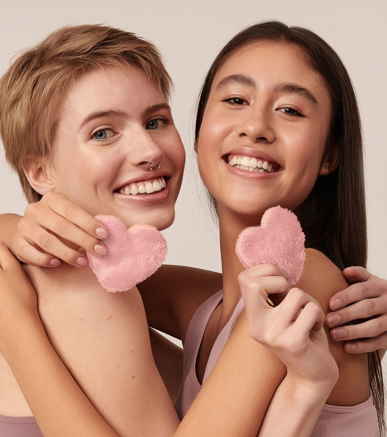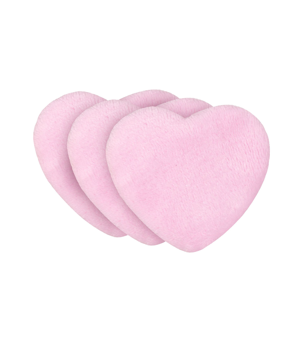 Mas isso não é tudo. Este conjunto também inclui três almofadas cosméticas ultramacias em forma de coração. Estas almofadas patenteadas e reutilizáveis permitem-lhe alcançar facilmente todos os cantos e dobras do seu rosto. Use sozinho com água ou com seus produtos de limpeza favoritos para desfrutar de uma pele mais clara e radiante com GLOV®.