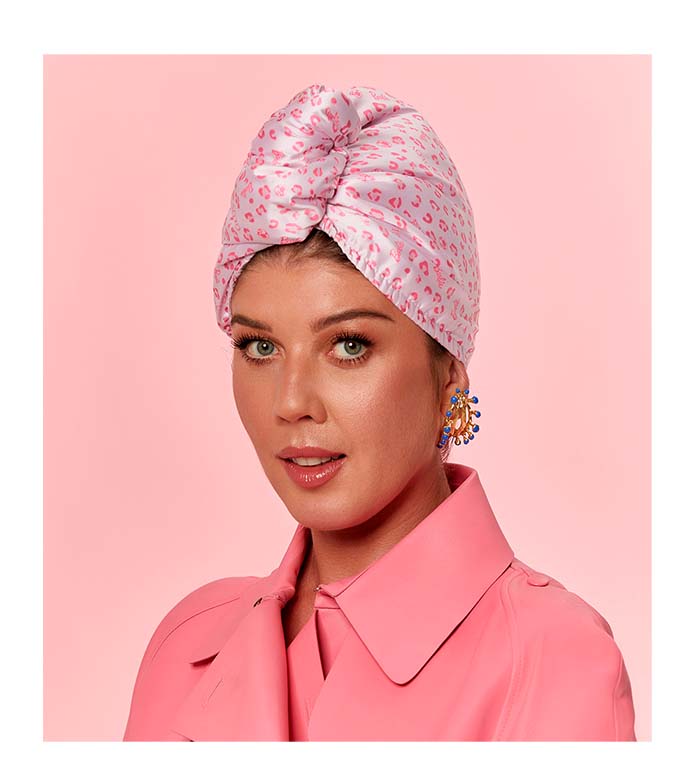 Este turbante tem dupla face: cetim de um lado e tecido absorvente do outro.
