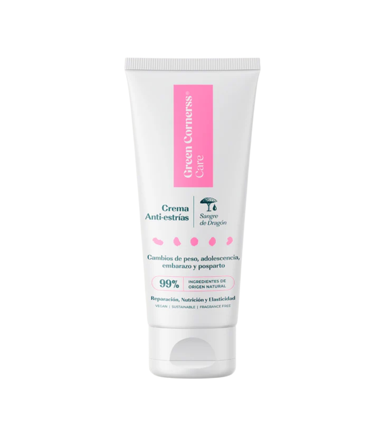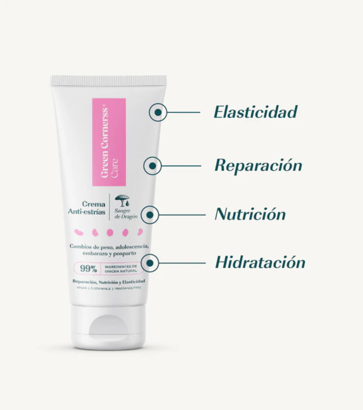 Green Cornerss O Creme Antiestrias é formulado com 99% de ingredientes naturais, projetado para prevenir e tratar estrias causadas por gravidez, amamentação, alterações hormonais, flutuações de peso ou esportes.