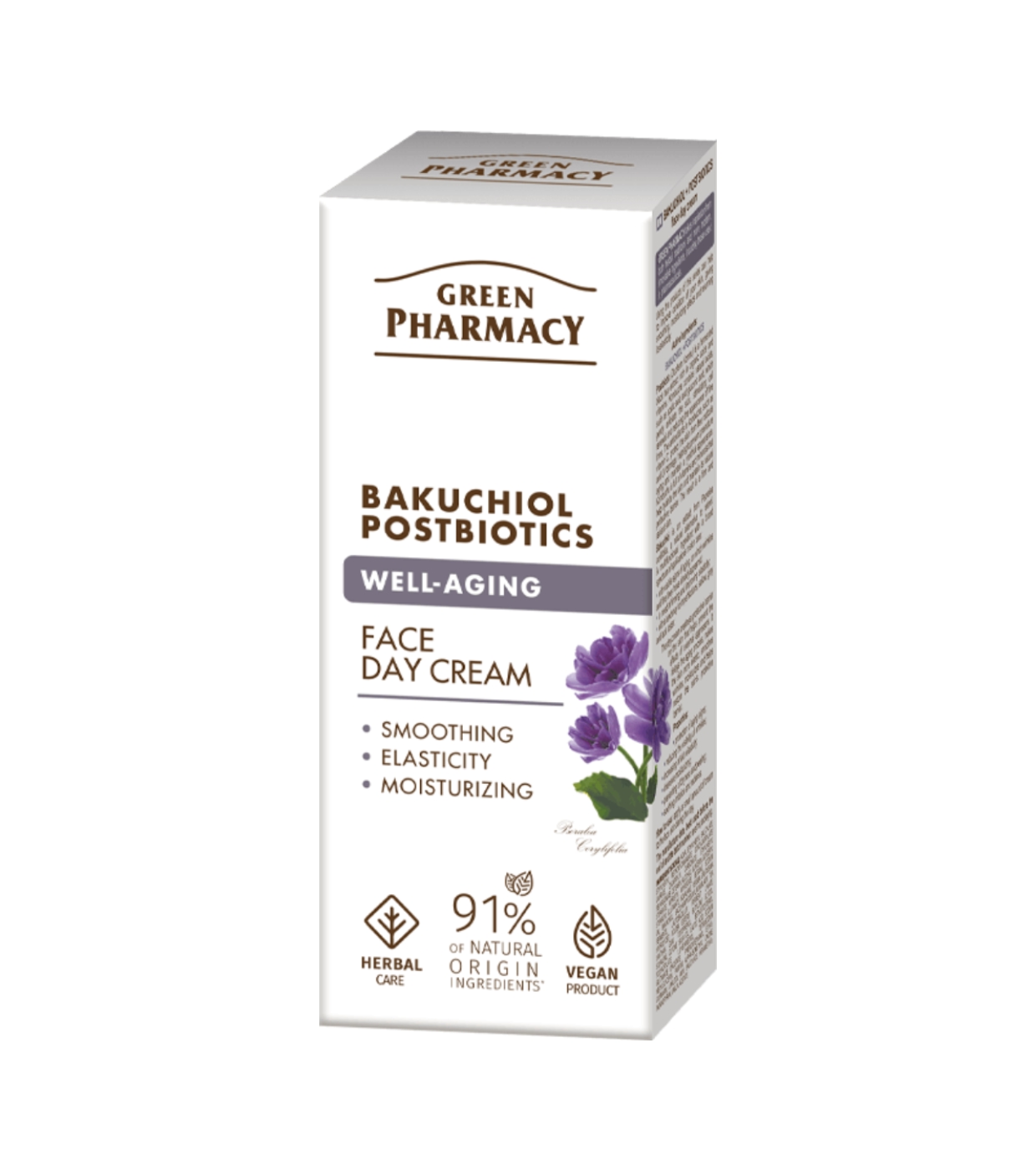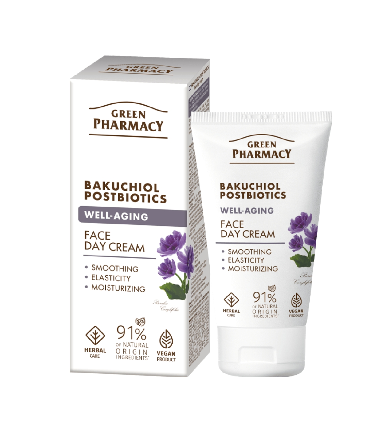 Green Pharmacy O Creme Facial Antienvelhecimento Diurno Backuchiol & Postbiotics cria uma barreira protetora que protege a pele de agressores externos, ao mesmo tempo em que atua ativamente para suavizar rugas, melhorar a elasticidade e hidratar intensamente.