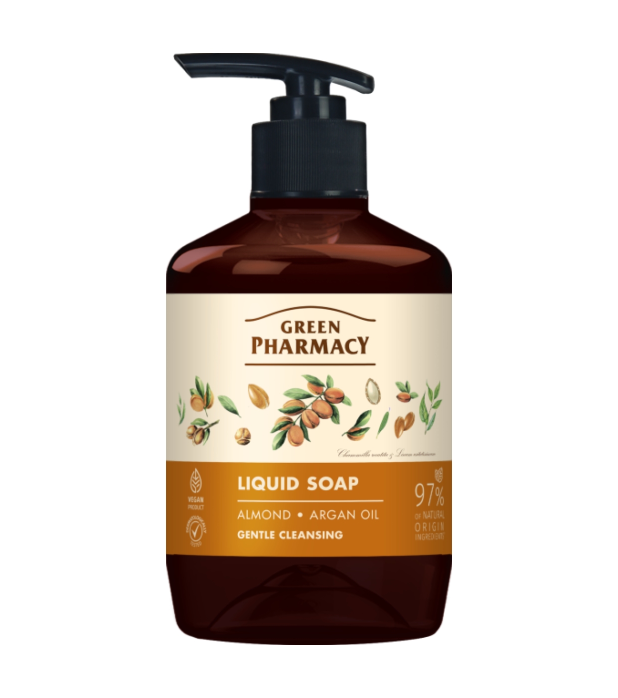 Desfrute de uma limpeza delicada e nutritiva com o sabonete lÃquido para mãos com Amêndoas e Óleo de Argan da Green Pharmacy , ideal para o cuidado diário da pele.
