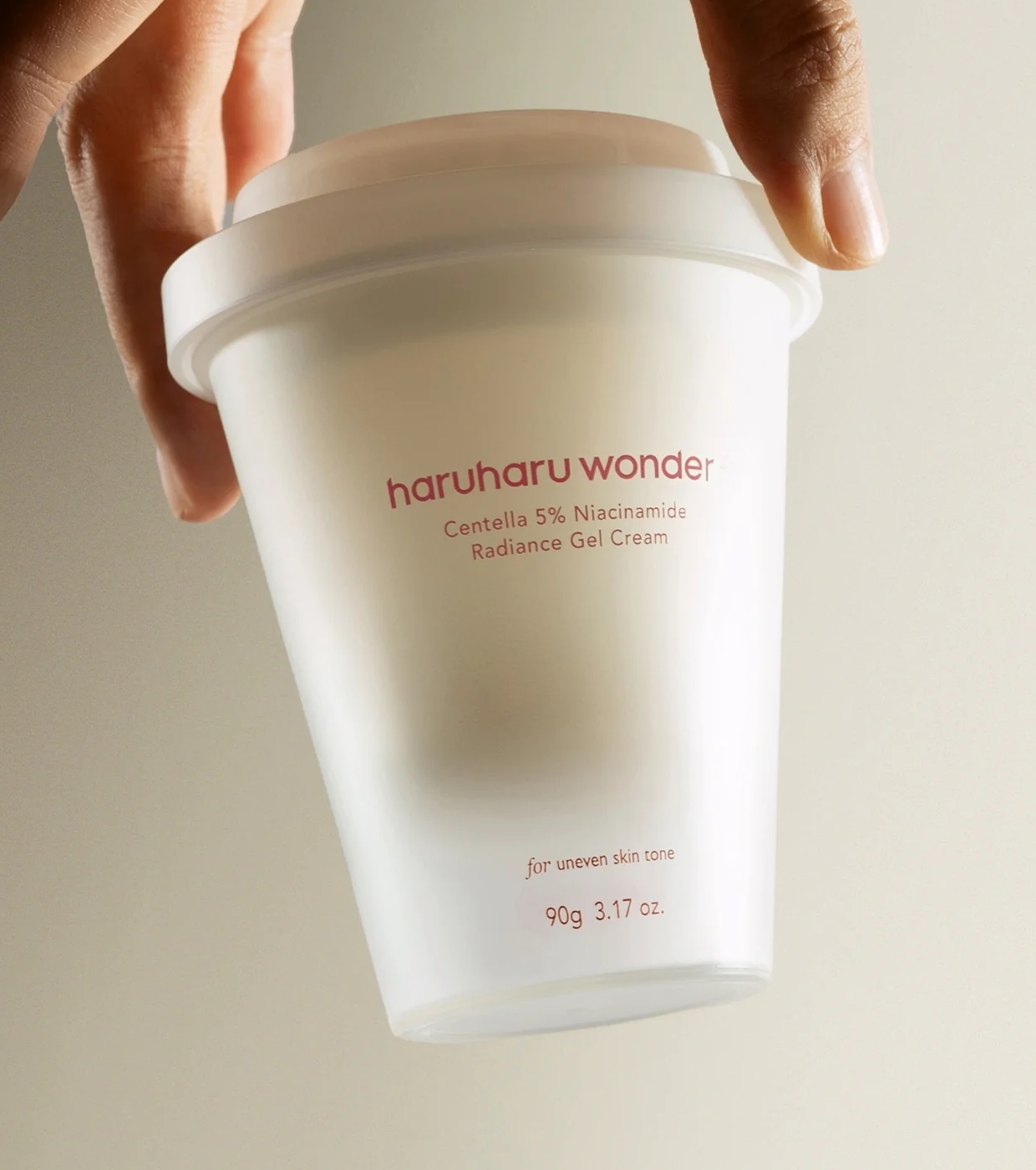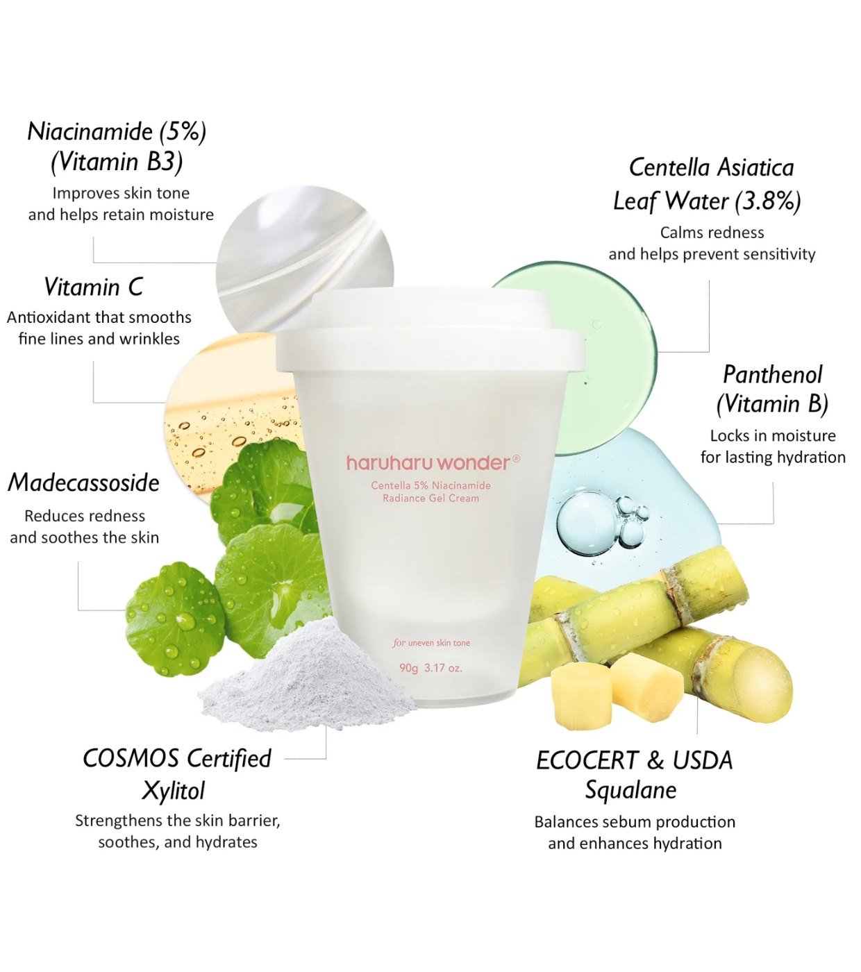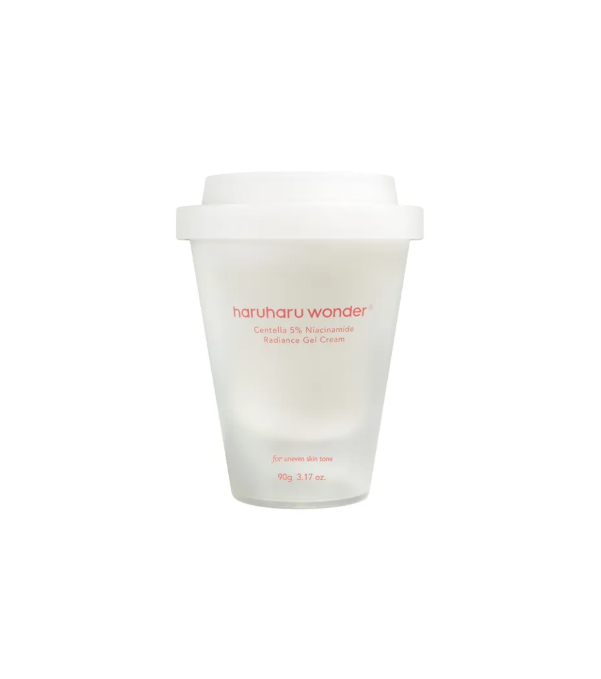 Centella 5 % Niacinamide Radiance Gel Face Cream da Haruharu Wonder é um creme leve com textura de gel que combina ingredientes ativos iluminadores e calmantes, ideal para todos os tipos de pele, especialmente peles sensíveis e peles propensas à hiperpigmentação.