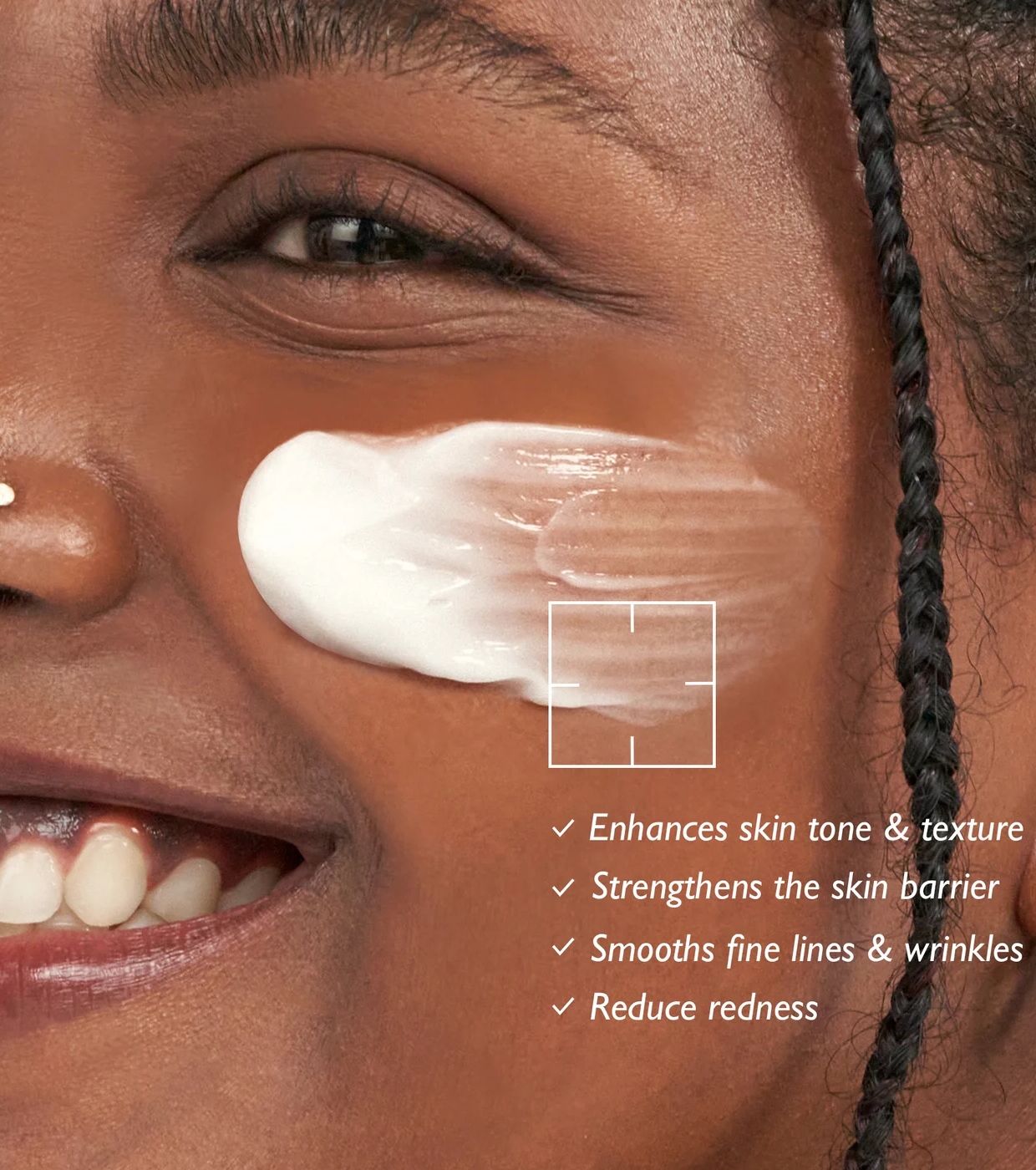 - Niacinamida 5% (Vitamina B3) e Vitamina C: unificam o tom da pele, reduzem manchas escuras, linhas finas e previnem a repigmentação.