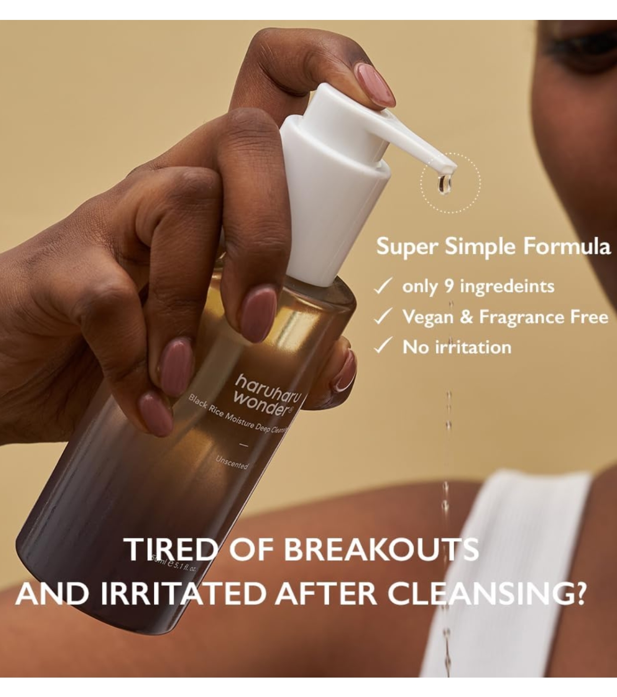 Este óleo de limpeza profunda Black Rice Deep da Haruharu Wonder é um limpador facial suave, eficaz e amigo da pele, ideal para a primeira fase da limpeza dupla.