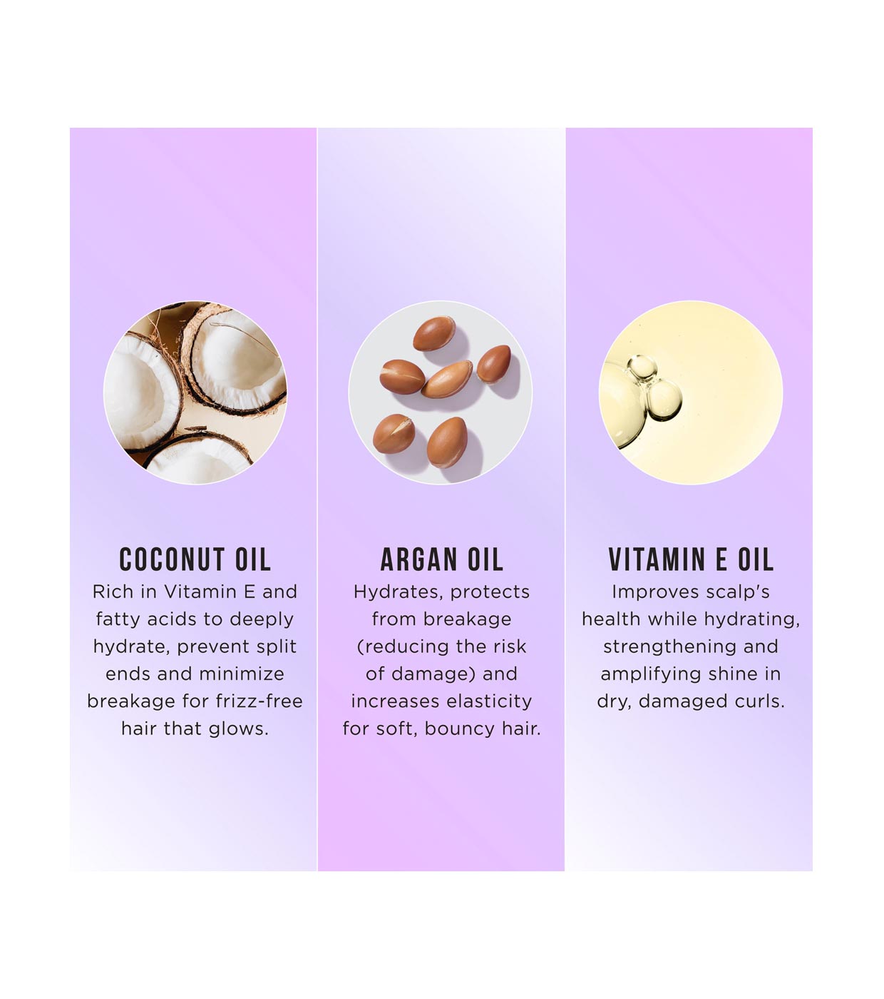Com óleo de coco, óleo de argan orgânico e vitamina E para nutrir, proteger e definir os cachos.