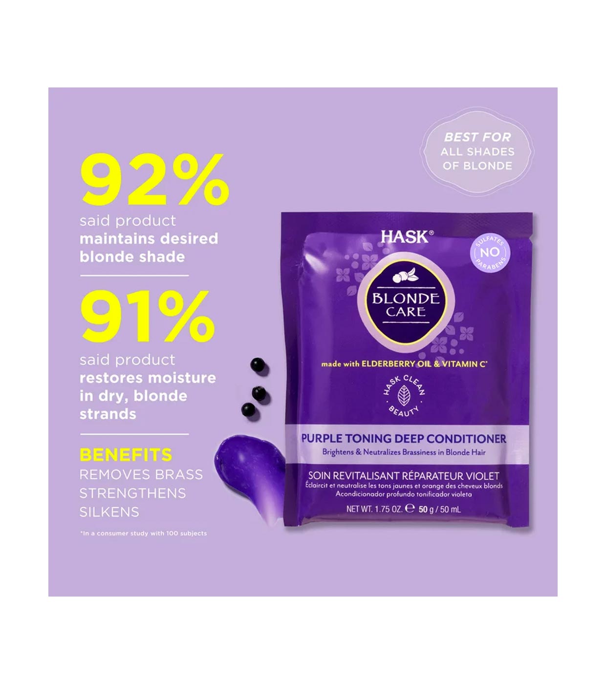 Esta fórmula violeta altamente pigmentada hidrata profundamente enquanto neutraliza os tons amarelos opacos para um tom loiro mais fresco.