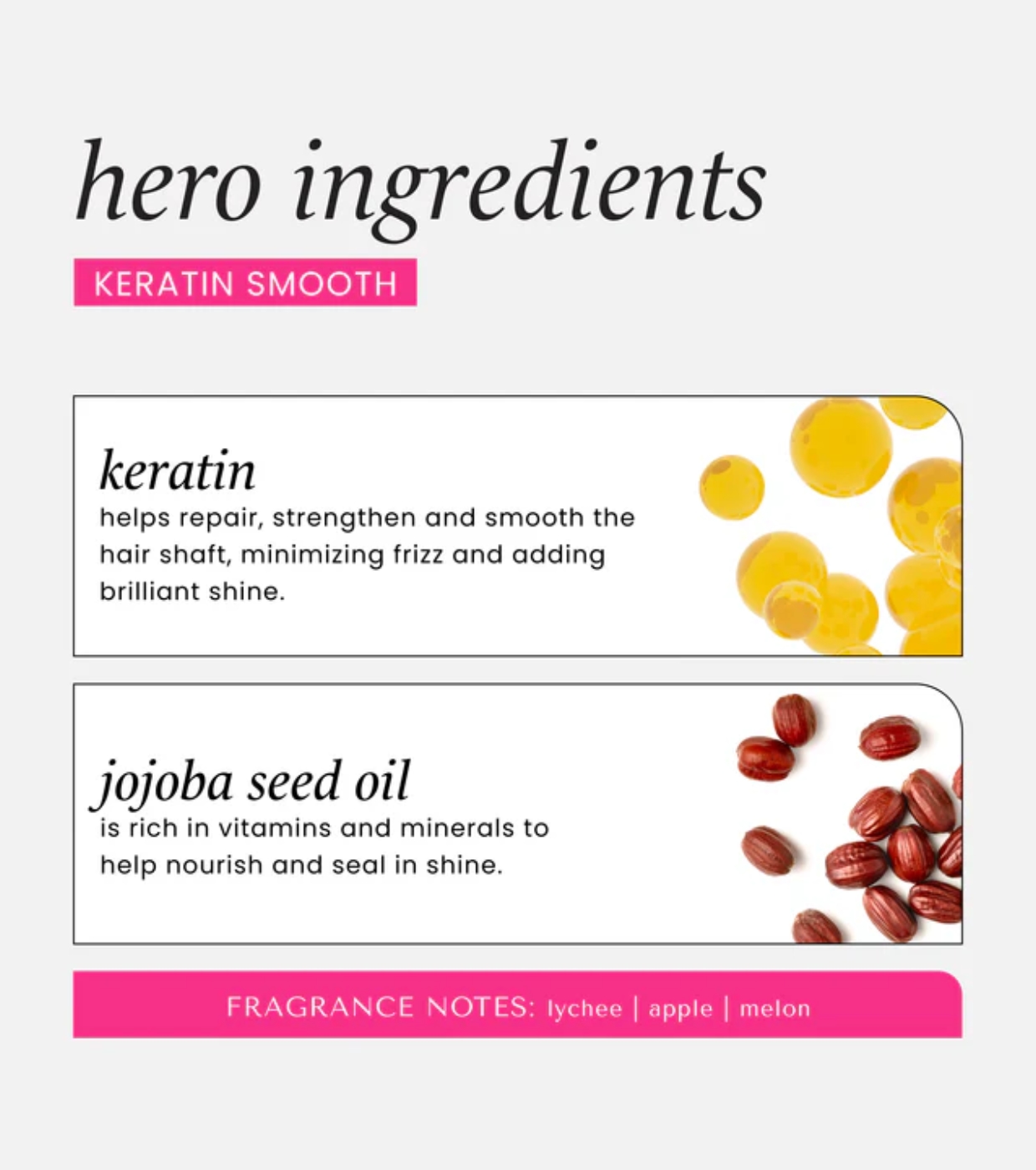 - Formulado com queratina suavizante para melhorar a textura do cabelo.