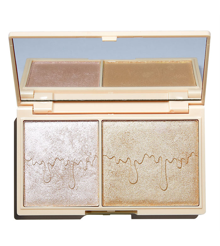 Um duo de iluminadores de sonho em sedosos tons de rosa e perolado com um toque dourado.