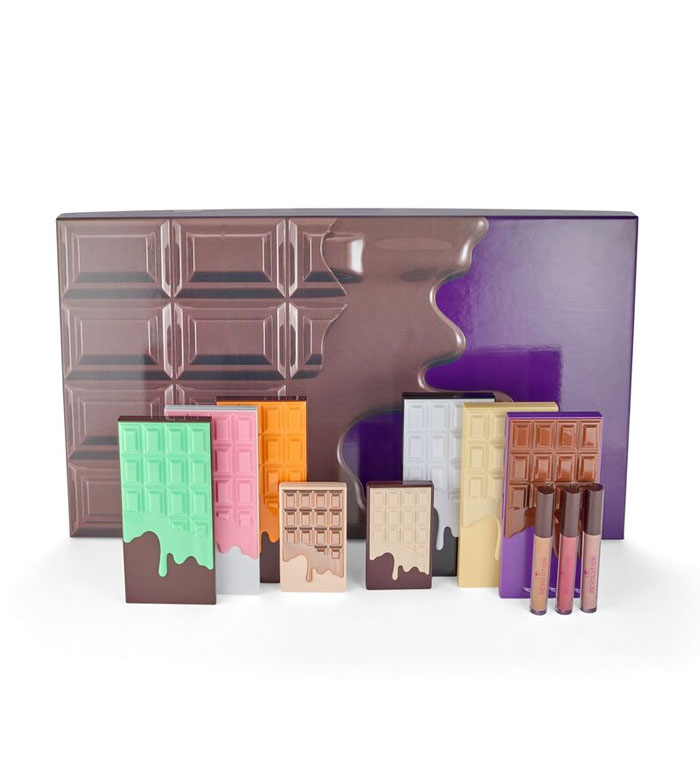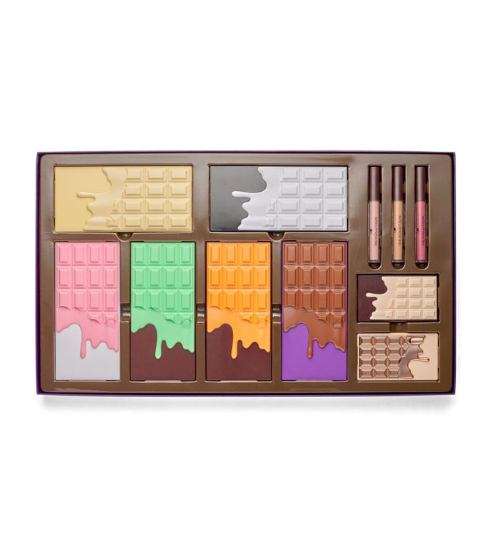 Incluye un total de 5 paleta de sombras de ojos, 3 paletas de rostro y 3 brillos labiales con delicioso aroma a chocolate.