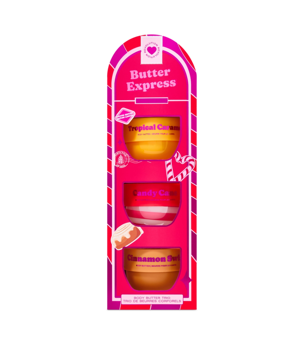 Mime a sua pele com o I Heart Revolution Butter Express Body Butter Set , um trio irresistível de mini manteigas corporais (68 g cada), desenvolvido para hidratar profundamente e envolver a sua pele com aromas doces e festivos.