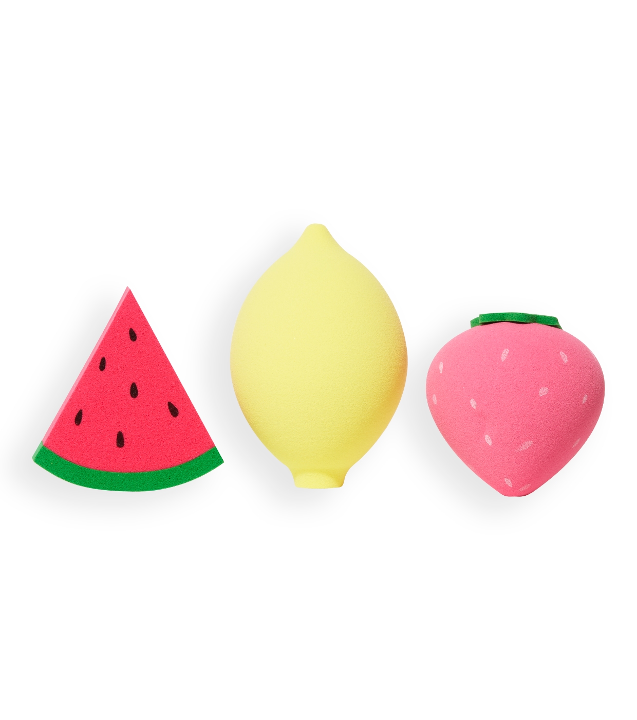 Obtenha uma base impecável e espalhe sua maquiagem sem esforço com o trio de esponjas de maquiagem Fruit Punch da Revolution .