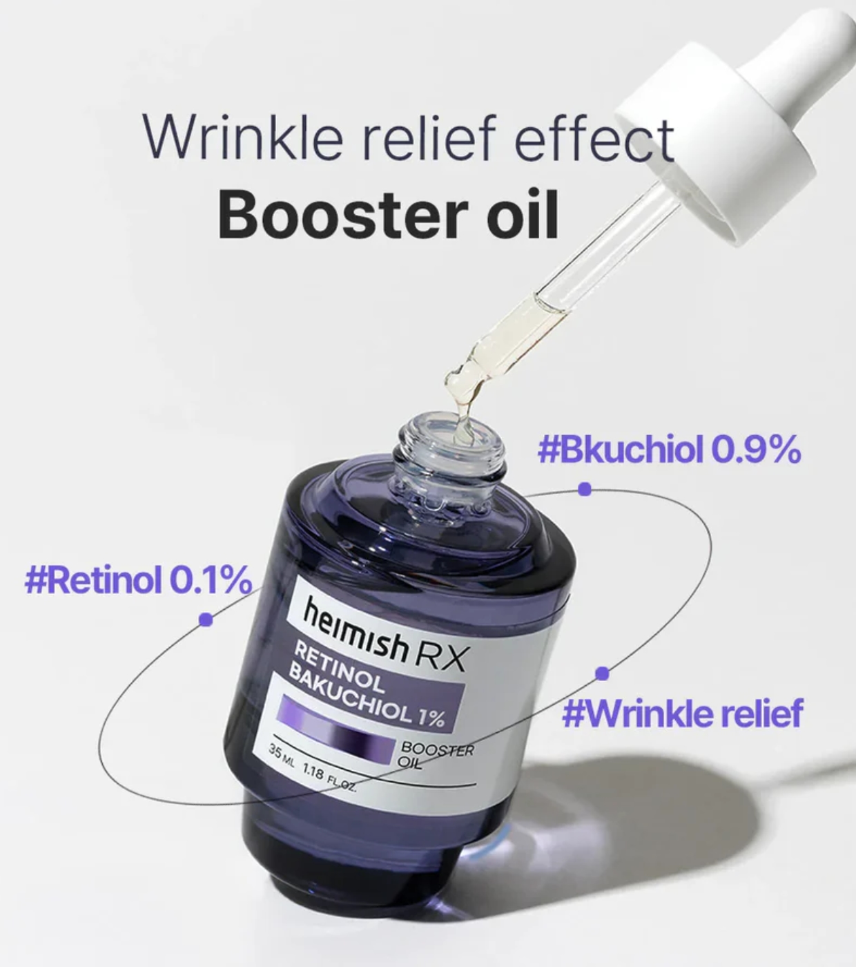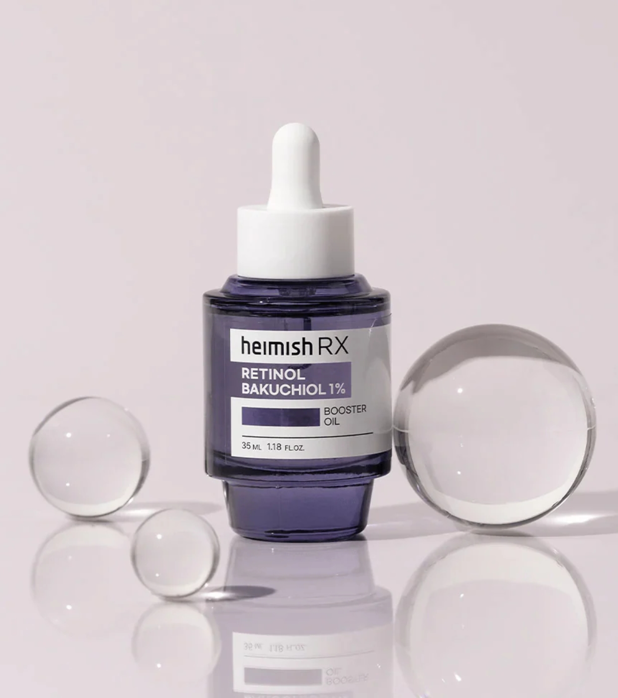 Heimish RX Retinol Bakuchiol Booster Oil é um óleo facial antienvelhecimento de alto desempenho que combina a eficácia do retinol (0,1%) com o poder vegetal do bakuchiol (0,9%), conhecido como a alternativa natural ao retinol.