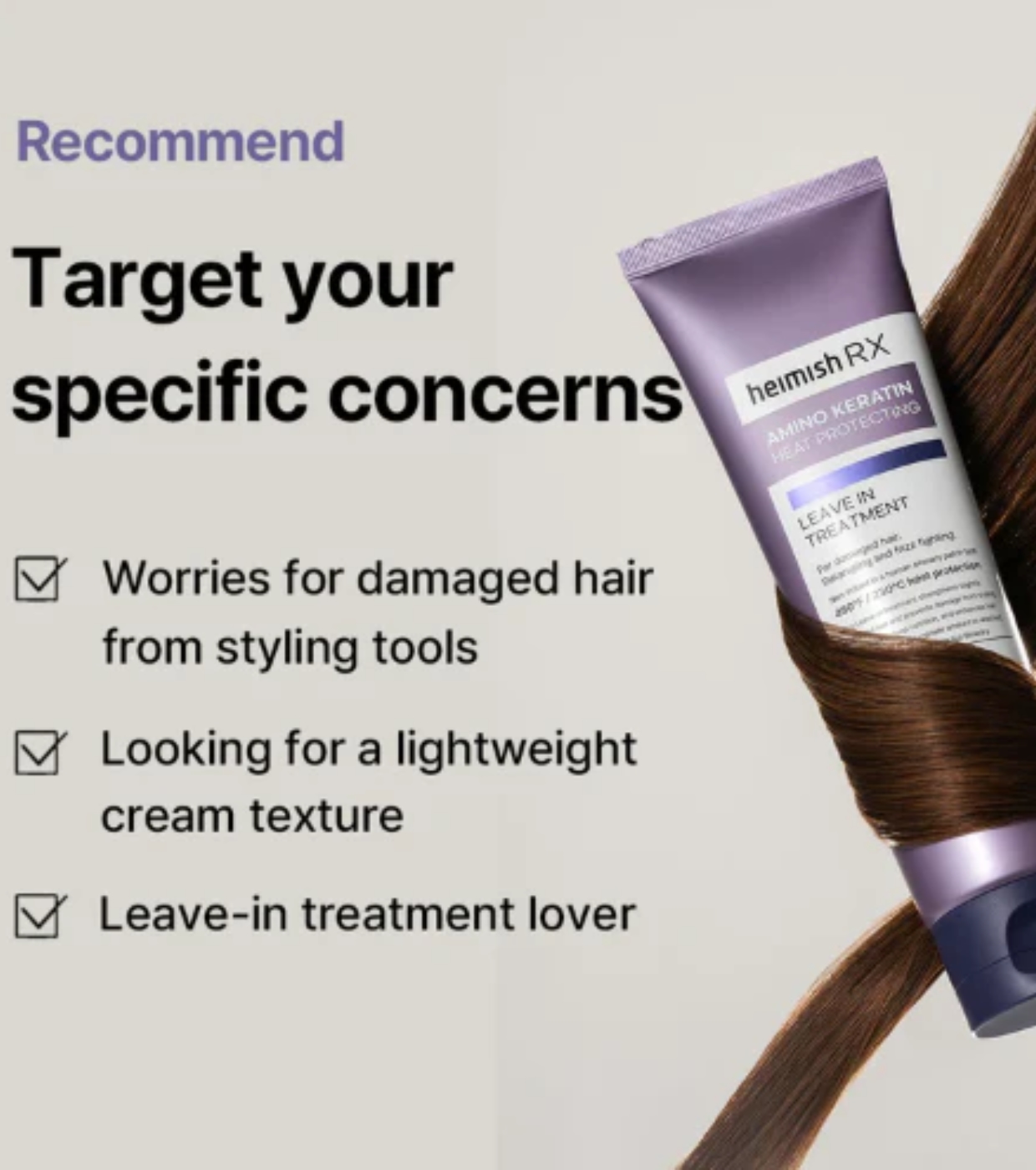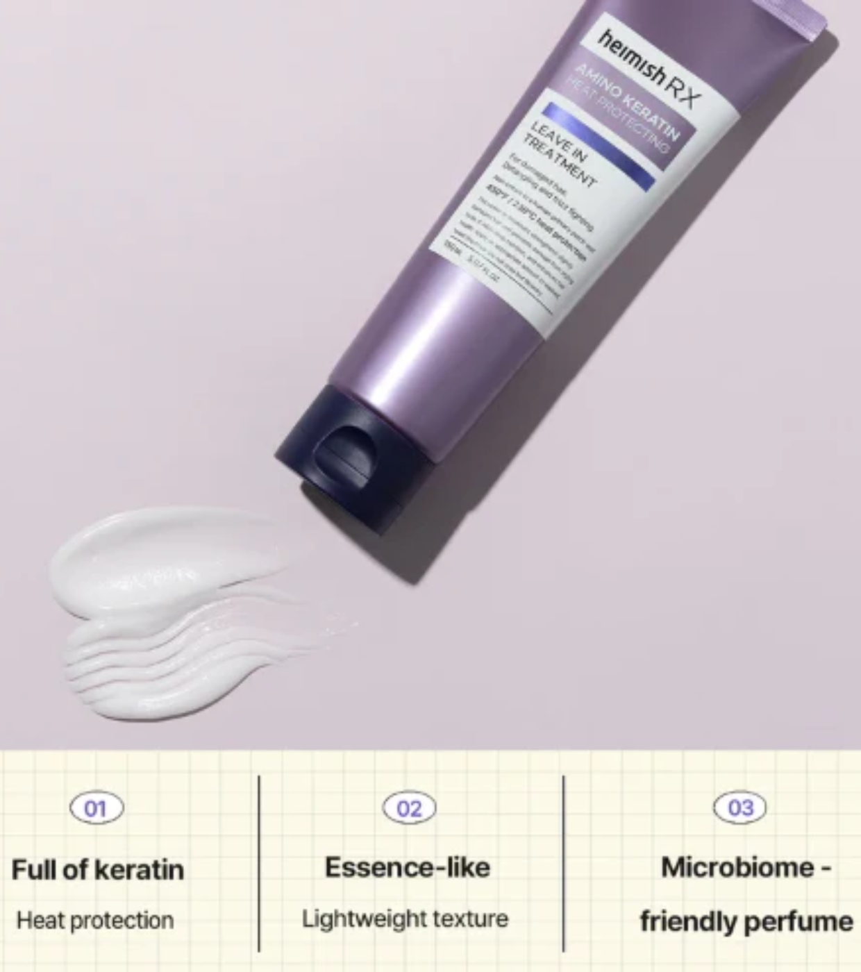O tratamento capilar sem enxágue Heimish Leave in Amino Keratin com queratina e aminoácidos foi desenvolvido para proteger seu cabelo dos danos causados pelo calor de chapinhas, secadores e modeladores de cachos, ao mesmo tempo em que proporciona nutrição, maciez e brilho.