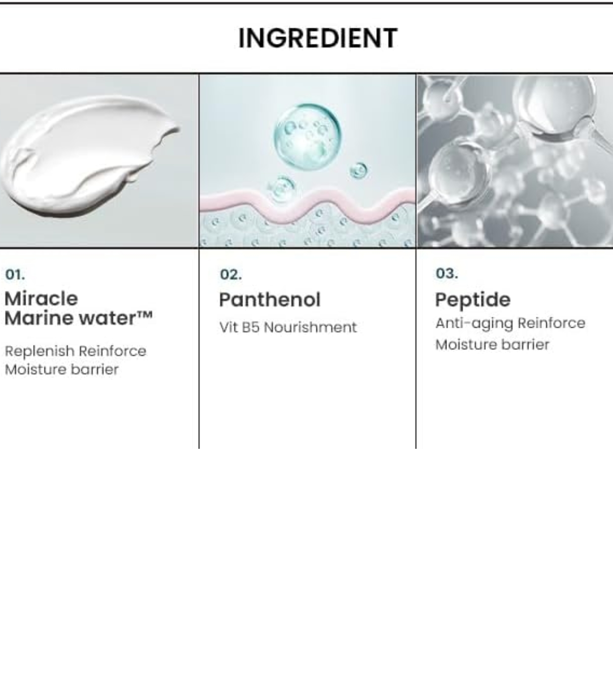 Sua fórmula, enriquecida com extrato de algas marinhas e água do mar, atua como um coquetel de minerais e antioxidantes que revitalizam, protegem e melhoram a elasticidade e a textura da pele.