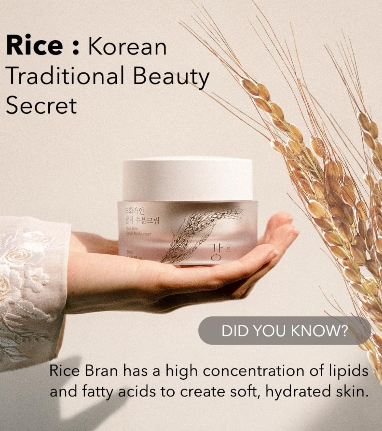 Rice Bran Facial Moisturizer O hidratante facial de farelo de arroz é um creme facial coreano formulado com farelo de arroz, um ingrediente tradicional em cosméticos coreanos, usado há séculos por suas propriedades hidratantes, calmantes e iluminadoras.