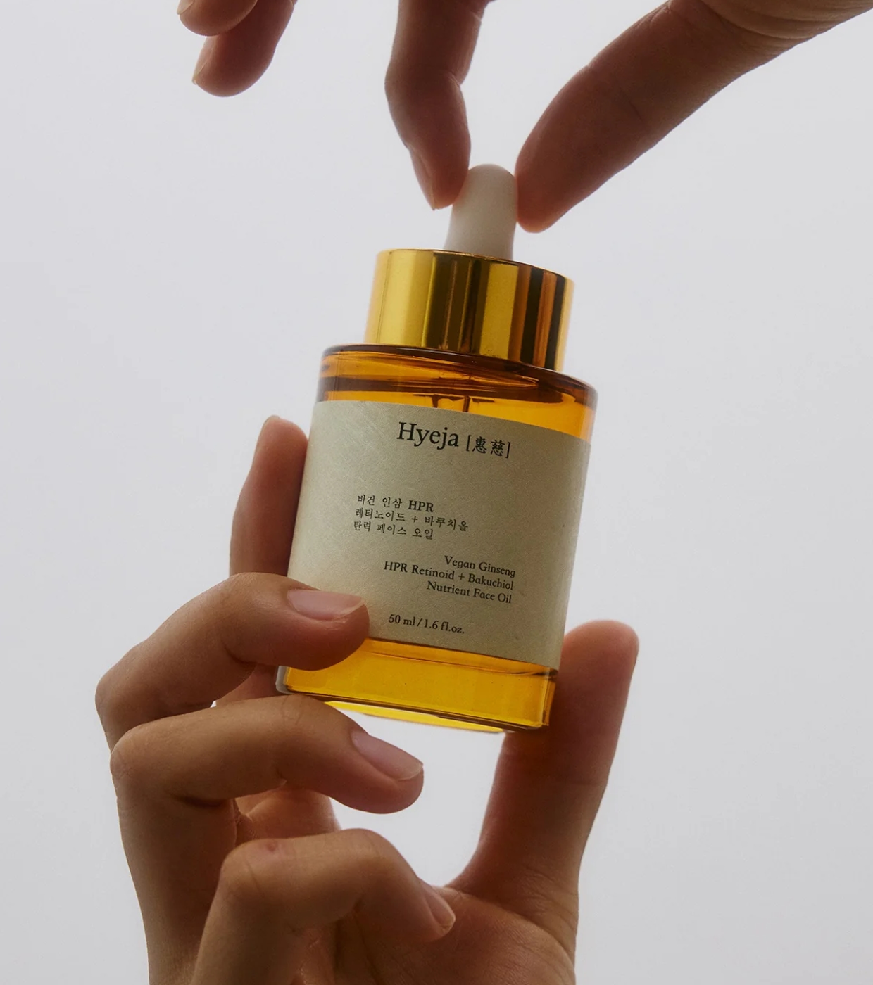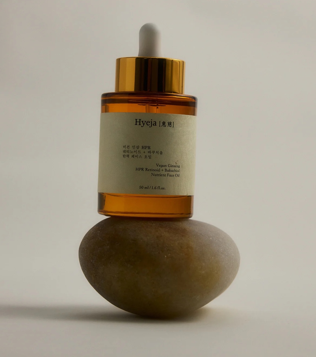 O óleo facial vegano Vegan Ginseng HPR Retinoid + Bakuchiol Nutrient Face Oil da Hyeja foi formulado para tratar de forma eficaz e suave os primeiros sinais de envelhecimento.