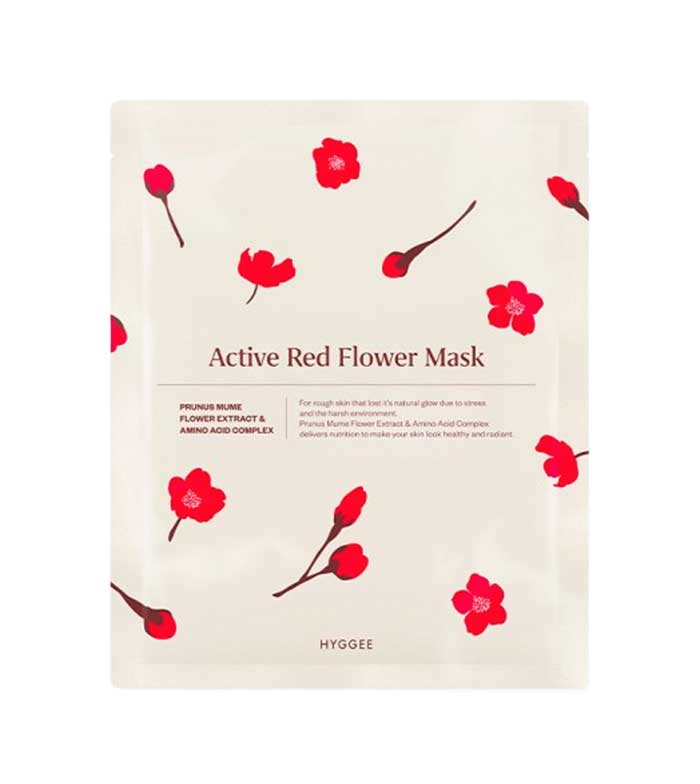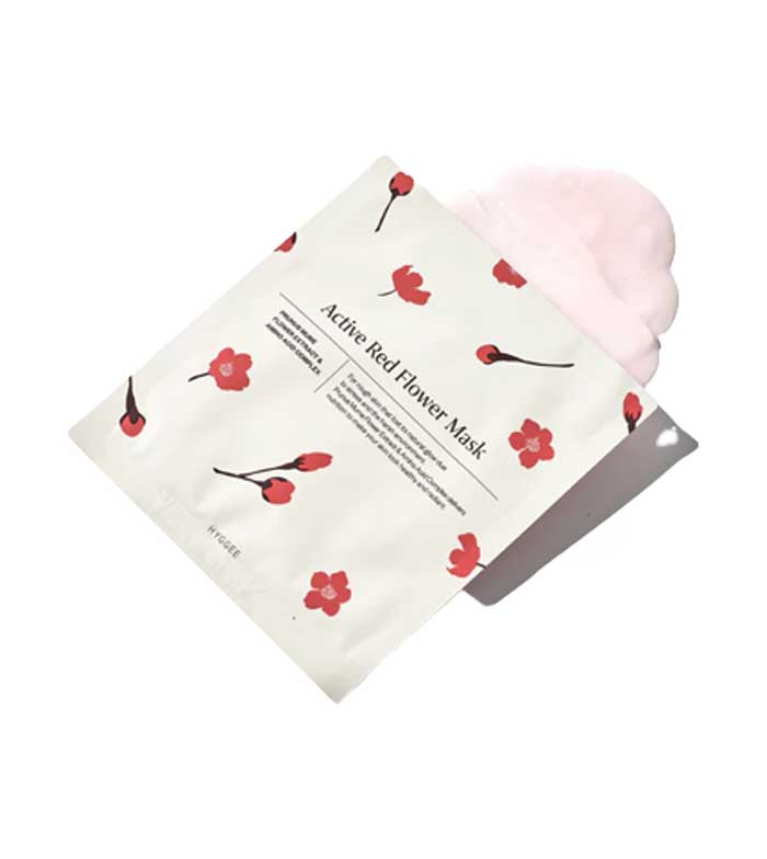 Active Red Flower Mask de Hyggee consegue hidratar profundamente, nutrir e proteger a pele do envelhecimento prematuro graças à sua fórmula completa.