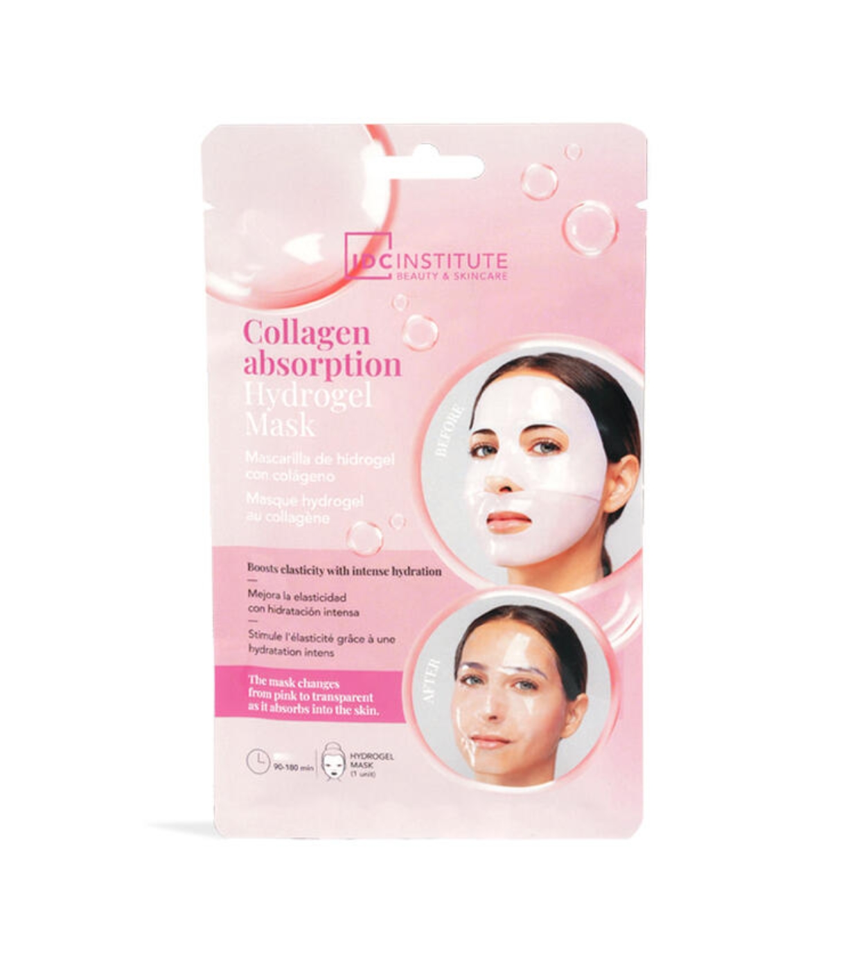 Descubra uma experiência inovadora de cuidados faciais com esta máscara de hidrogel Collagen Essence do IDC Institute que muda de cor enquanto age, indicando que a pele está absorvendo todos os seus benefícios.