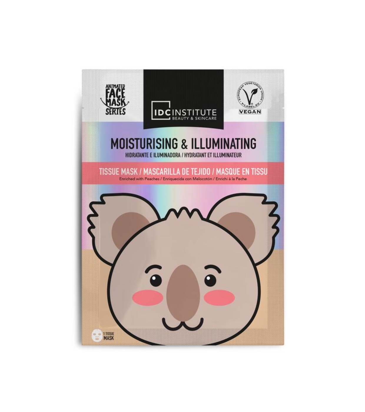 O design lúdico do coala esconde uma máscara facial vegana hidratante e iluminadora do Instituto IDC, que oferece cuidados hidratantes e iluminadores, ideais para combater o ressecamento e melhorar a textura da pele.