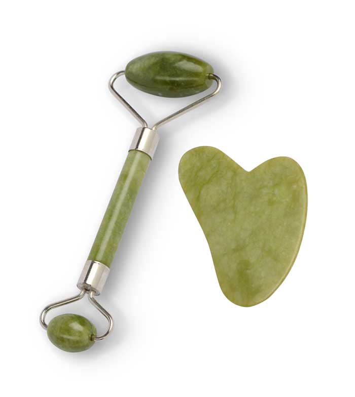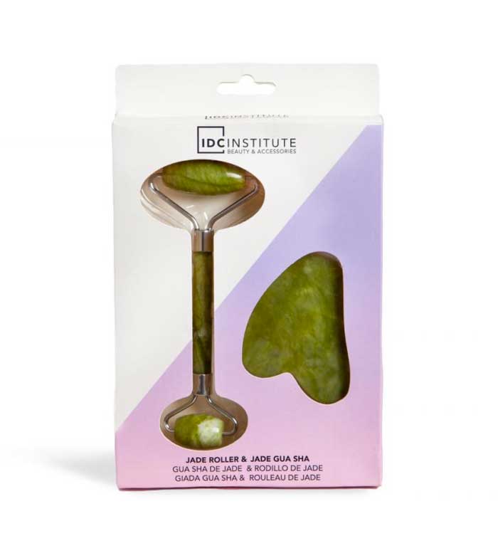 Rolo facial de jade e conjunto de gua sha do IDC Institute para massagear e revitalizar a pele do rosto.