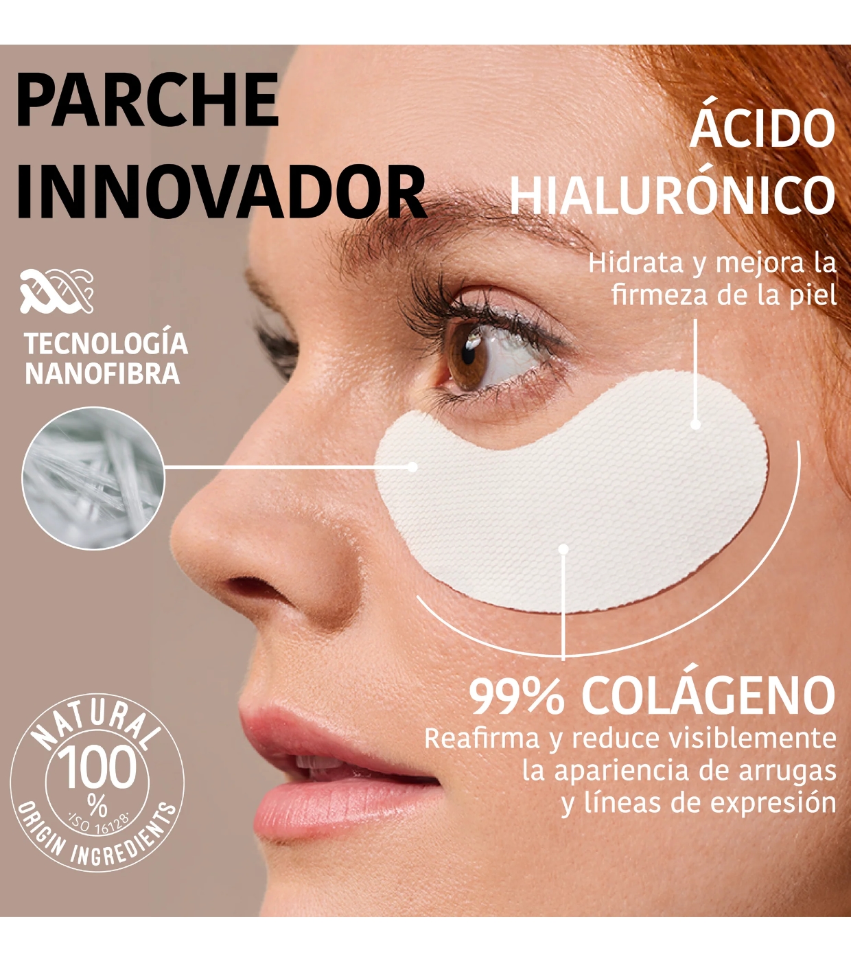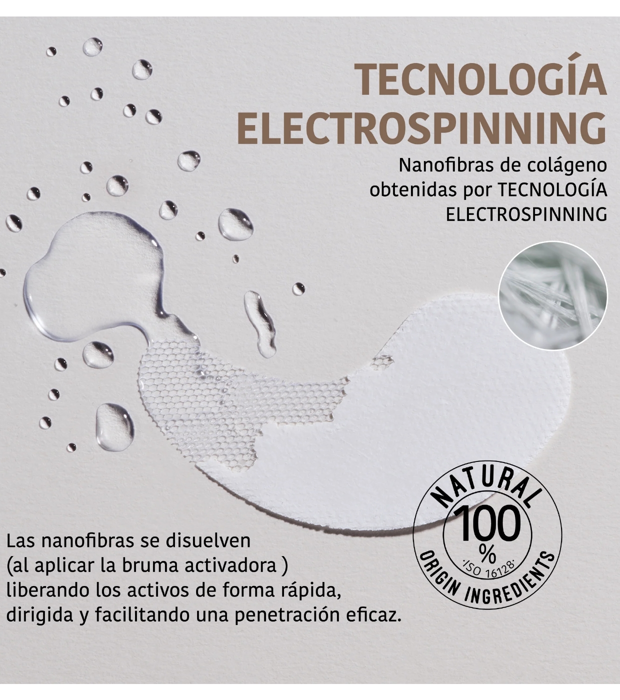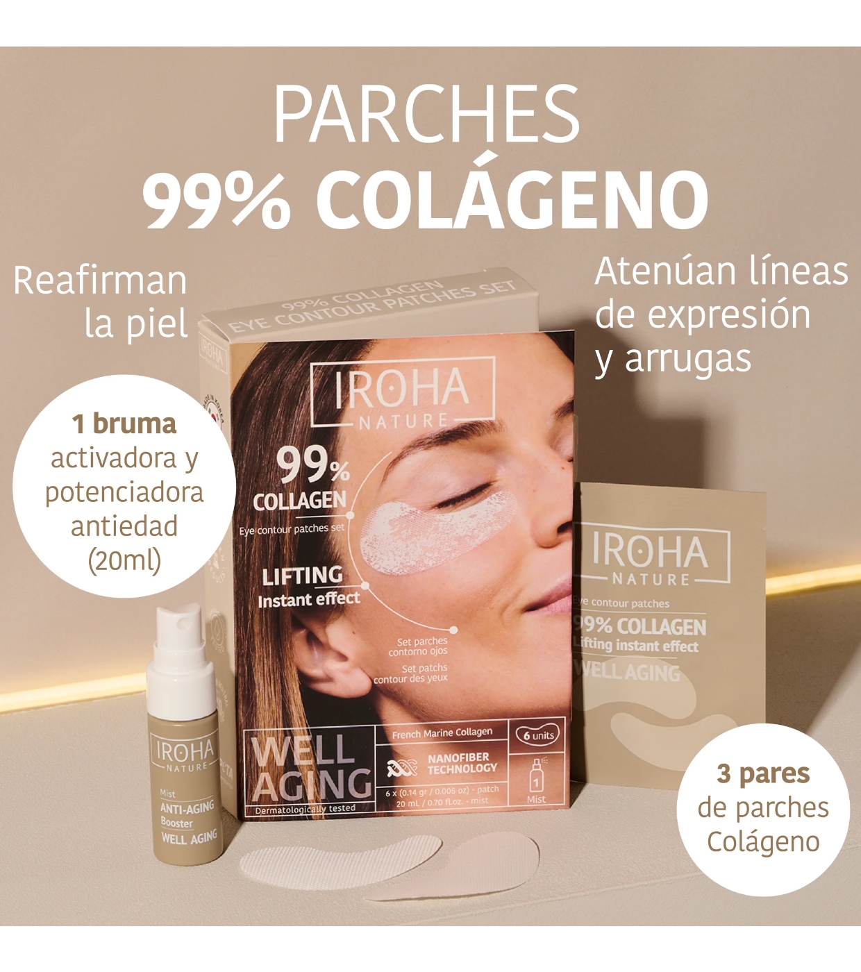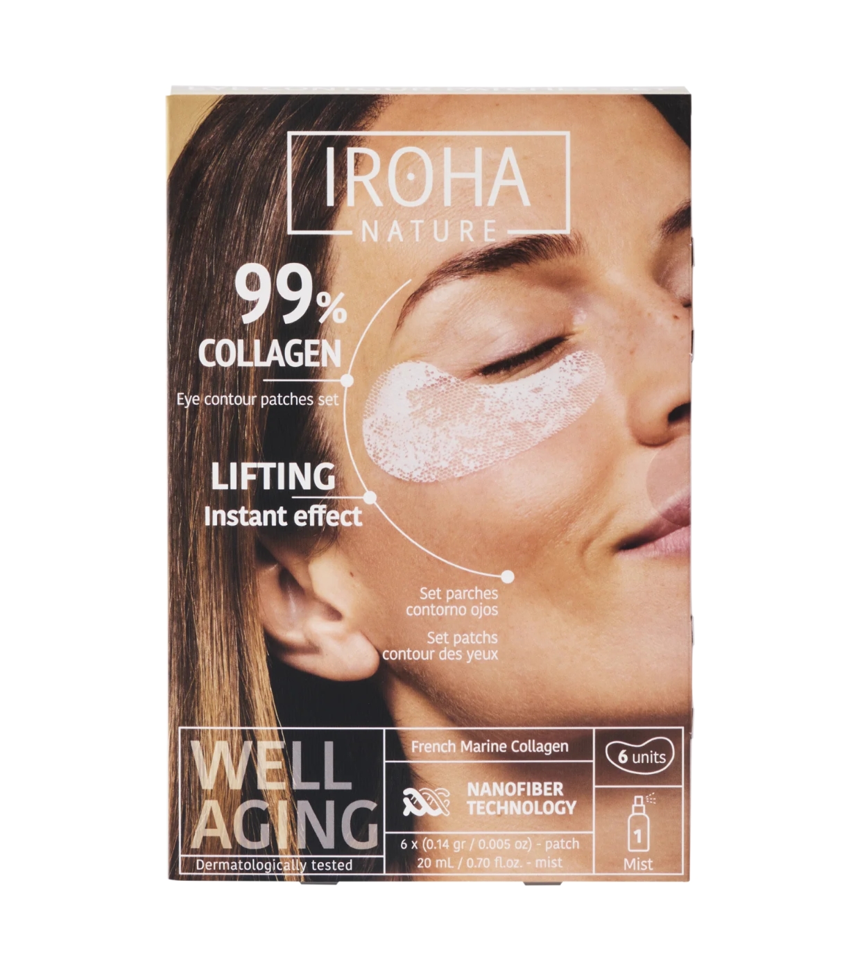 Os patches para contorno dos olhos 99% Collagen Lifting Effect da Iroha Nature combinam a inovadora tecnologia de eletrofiação com uma névoa ativadora que dissolve instantaneamente suas nanofibras, liberando colágeno diretamente nas camadas mais profundas da pele.